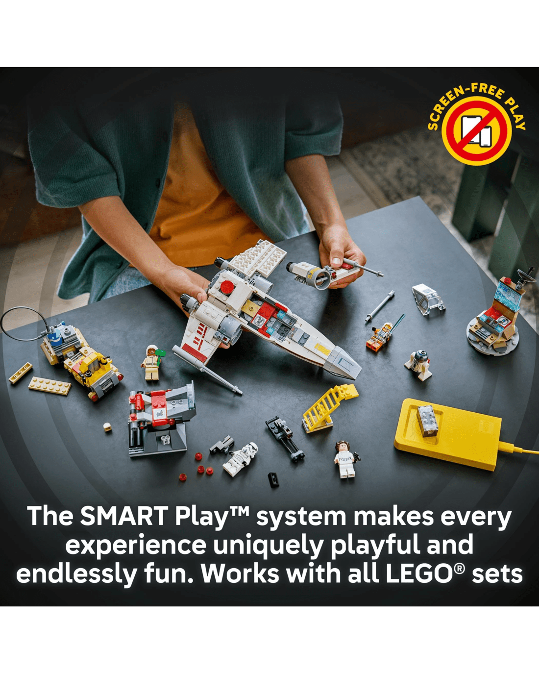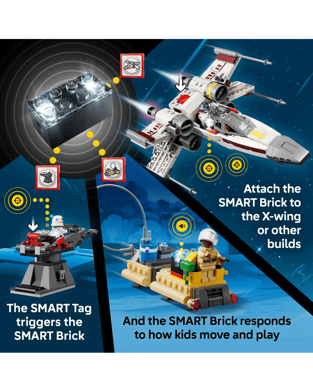 - Power Up the X-wing - Place the SMART Brick in the X-wing for motion-activated engine sounds and lights, laser-shooting noises, plus refuelling and repair sounds