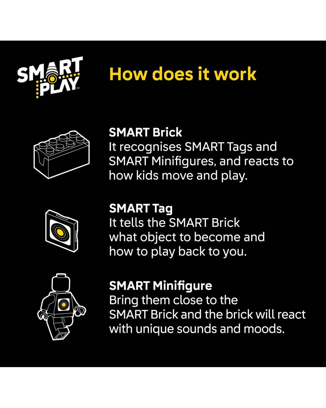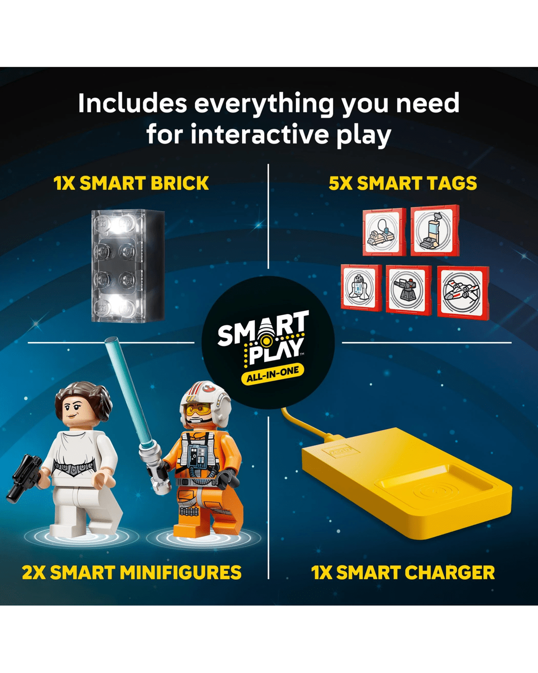 - 5 Smart Tags - SMART Tags for the X-wing, Imperial turret, transporter, command centre and R2-D2 activate the SMART Brick with dynamic sounds and lights in response to how kids move and play