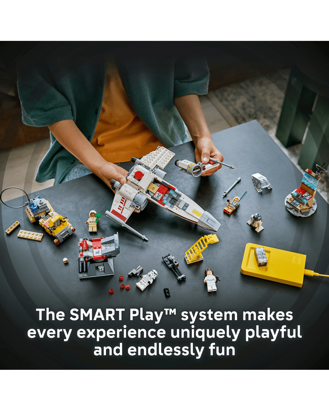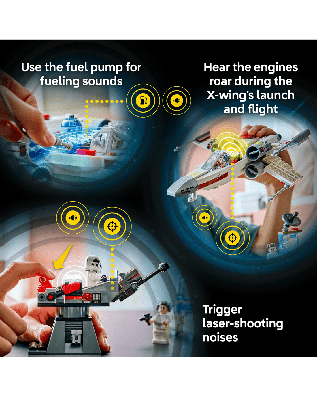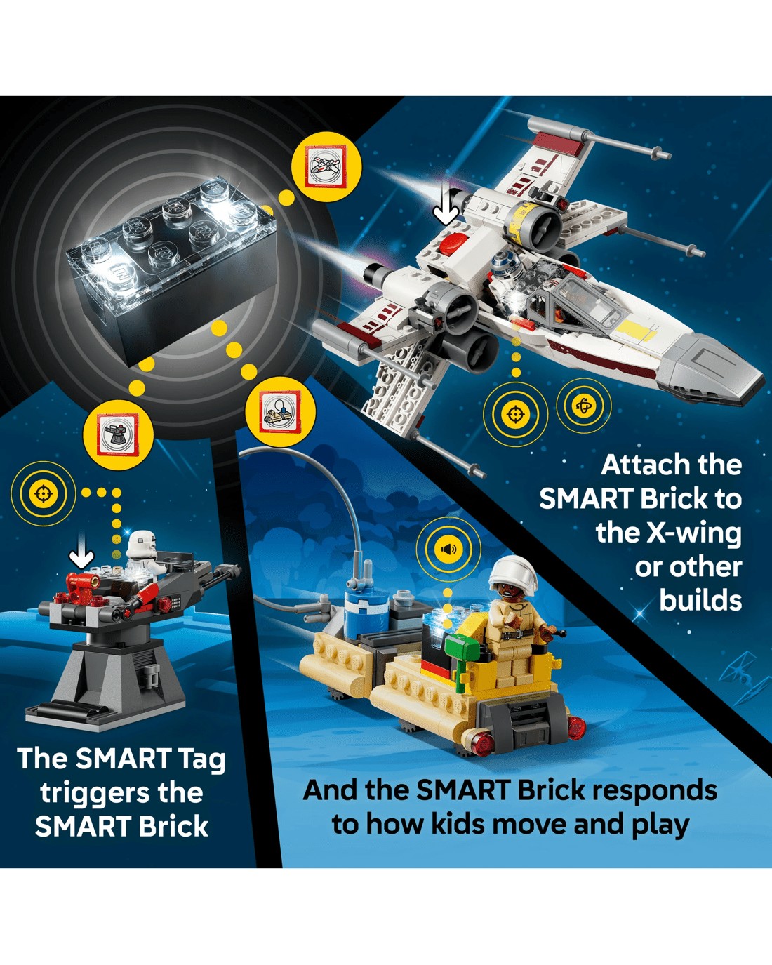 • Power Up the X-wing - Place the SMART Brick in the X-wing for motion-activated engine sounds and lights, laser-shooting noises, plus refuelling and repair sounds