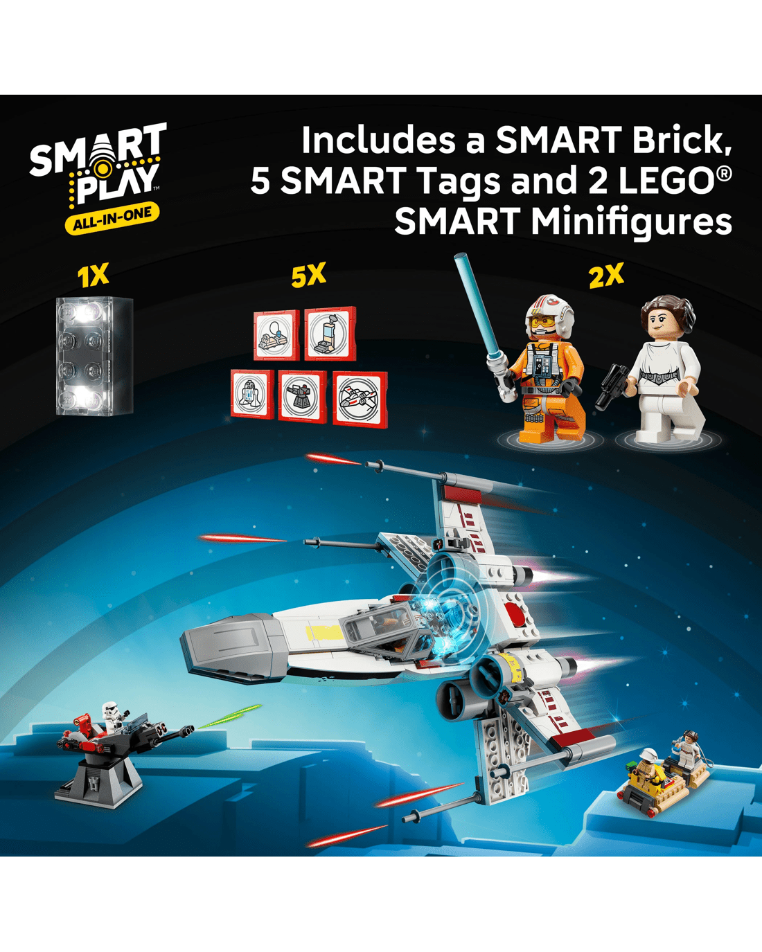 • 5 Smart Tags - SMART Tags for the X-wing, Imperial turret, transporter, command centre and R2-D2 activate the SMART Brick with dynamic sounds and lights in response to how kids move and play