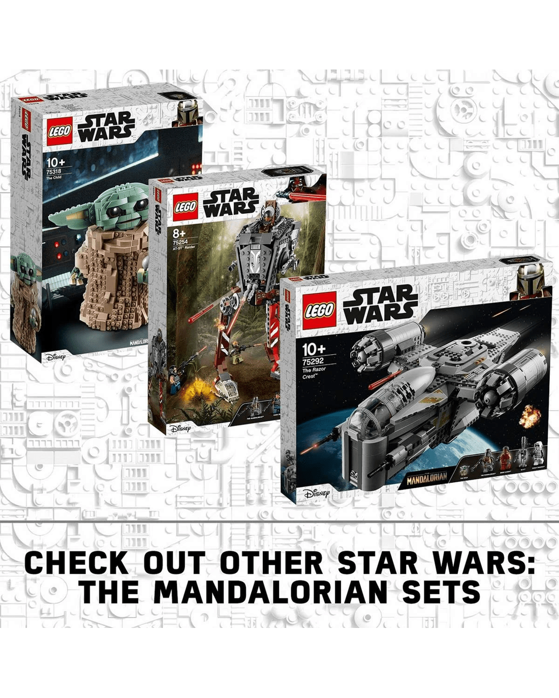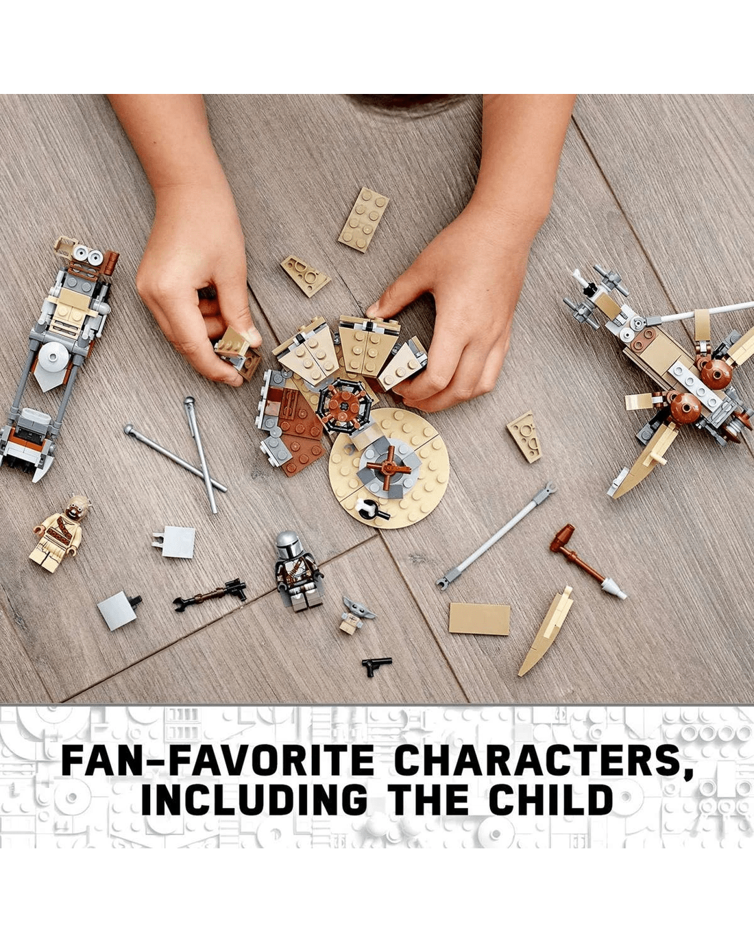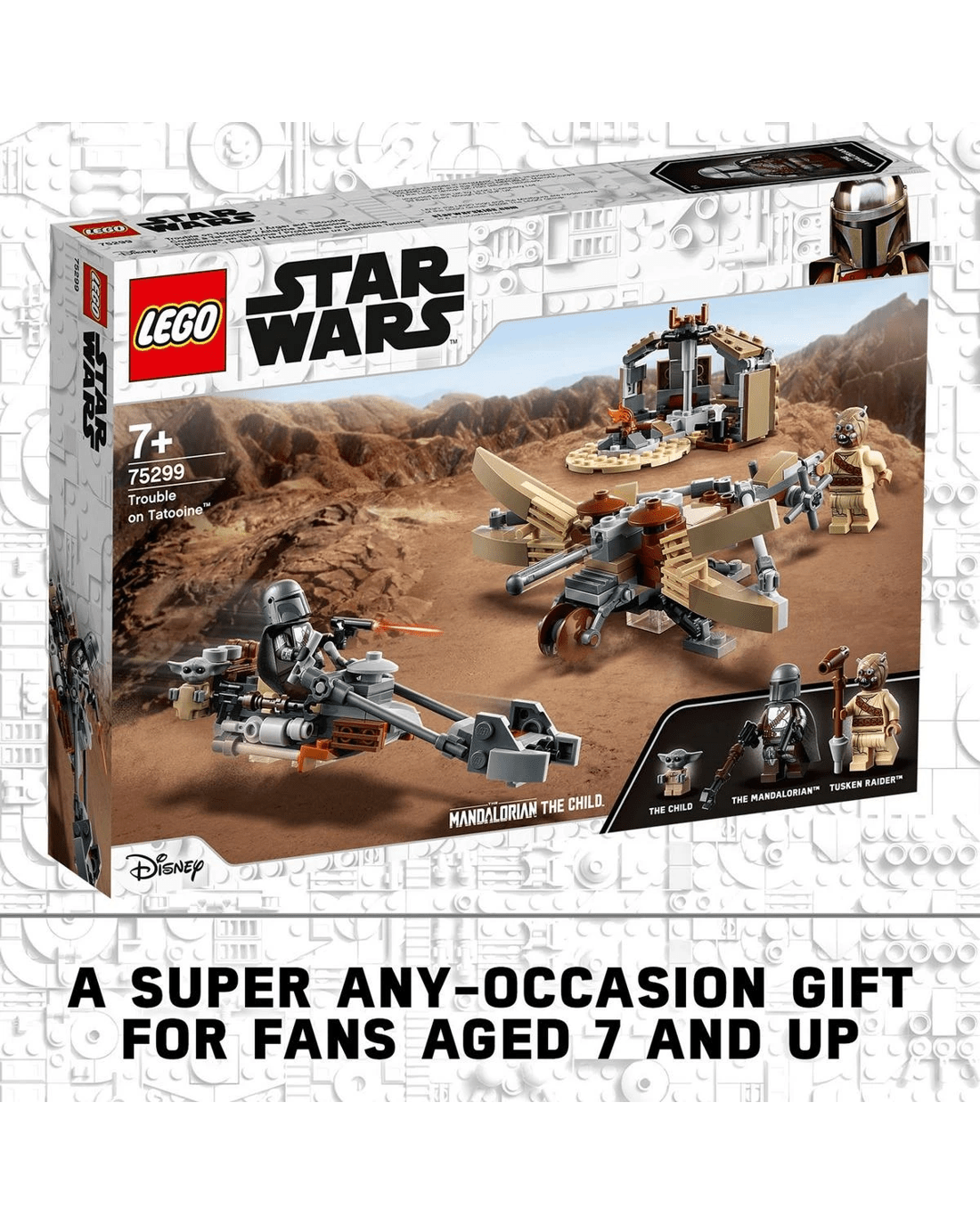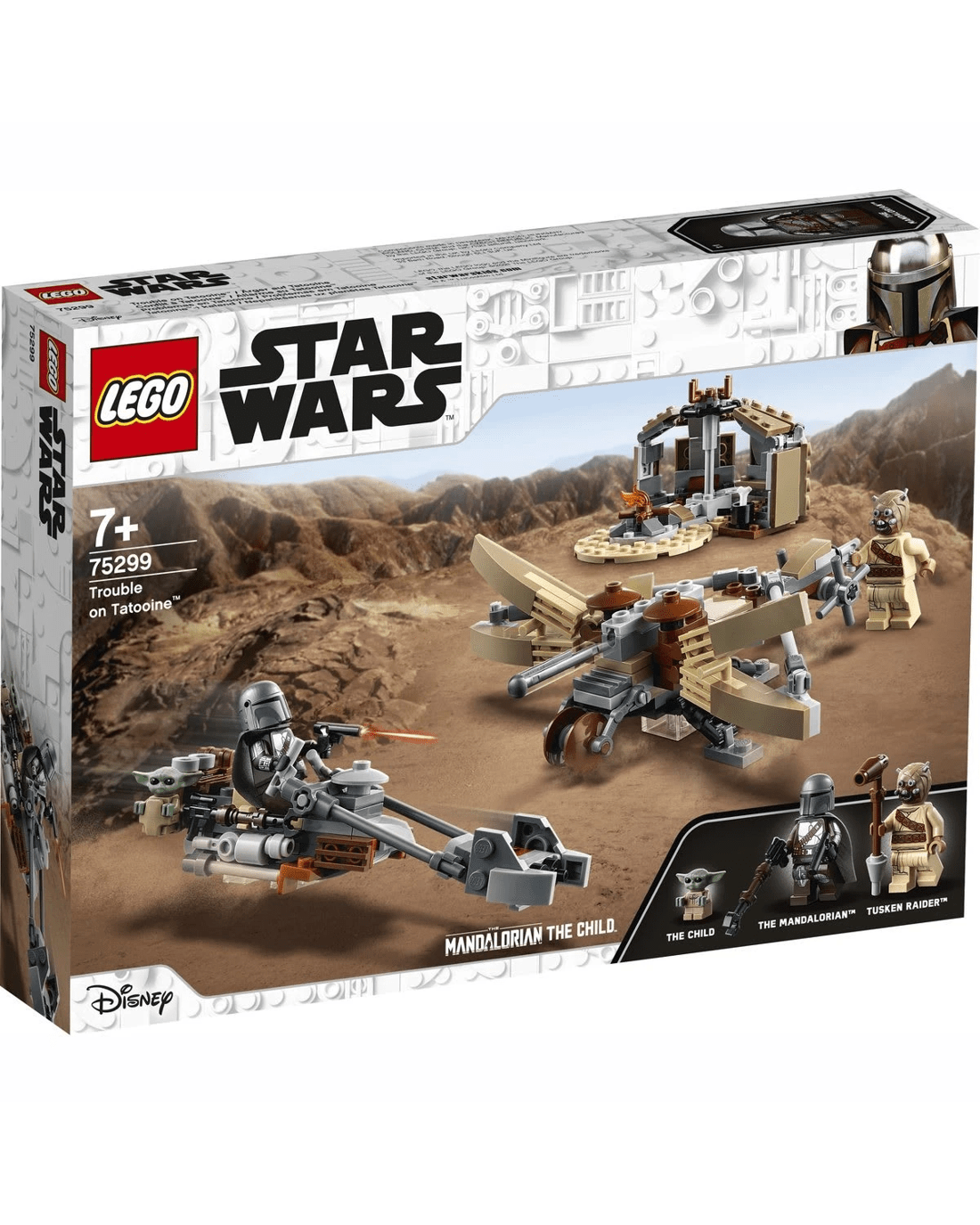 - Includes The Mandalorian and Tusken Raider LEGO minifigures, each with weapons for role-play battles, plus a LEGO figure of the Child (the popular character affectionately known as Baby Yoda).
