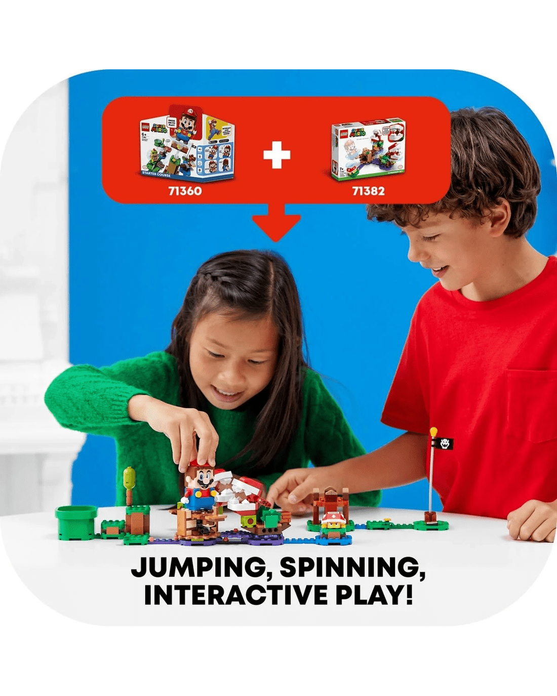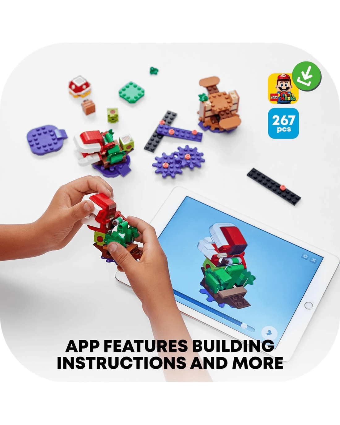 Let kids expand their LEGO Super Mario universe for extra fun with friends or solo play with this Piranha Plant Puzzling Challenge Expansion Set. It features 2 Piranha Plants and a Spiny figure for LEGO Mario (figure not included) to defeat and a spinning carousel to knock the Piranha Plants out of the way to reach 3 red-coin blocks offering big digital-coin rewards. (Note: the 71360 Starter Course set is required for interactive play.) Go digital - Instructions PLUS, featuring viewing tools to make building even more fun, is available for this set on the free LEGO Super Mario app. The app has tips on creative ways to rebuild and play and is a safe forum for kids to share their creations. Real-world Mario fun Collectible LEGO Super Mario toy playsets bring a family-favourite Nintendo character into the real world and make great gifts for trendsetting kids. The Starter Course building toy and Expansion Sets, plus Power-Up Packs, allow fans to create their own unique levels.