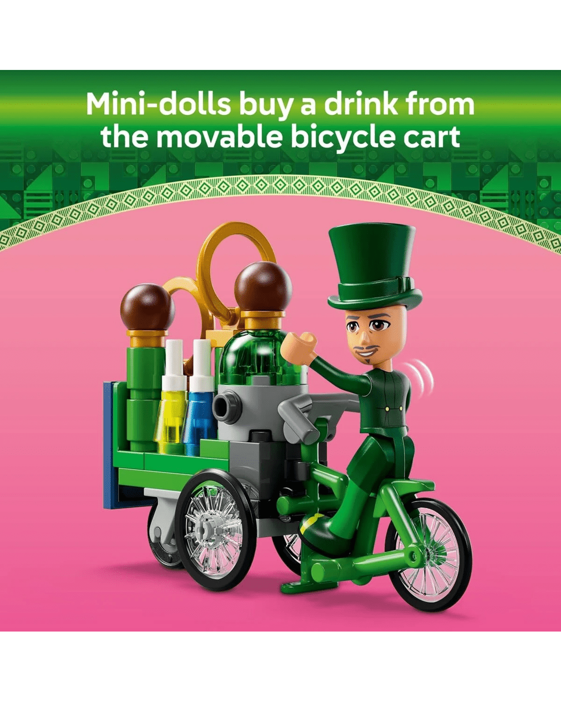 With five mini-dolls included, this fantasy toy lets kids play out Wicked friendship moments between the Fiyero, Glinda and Elphaba mini-doll figures as they browse the cosmetics shop, buy cakes or grab a drink from the bicycle coffee vendor. For more play inspiration, kids can scan the set's hidden QR code to access unique online LEGO Wicked content.