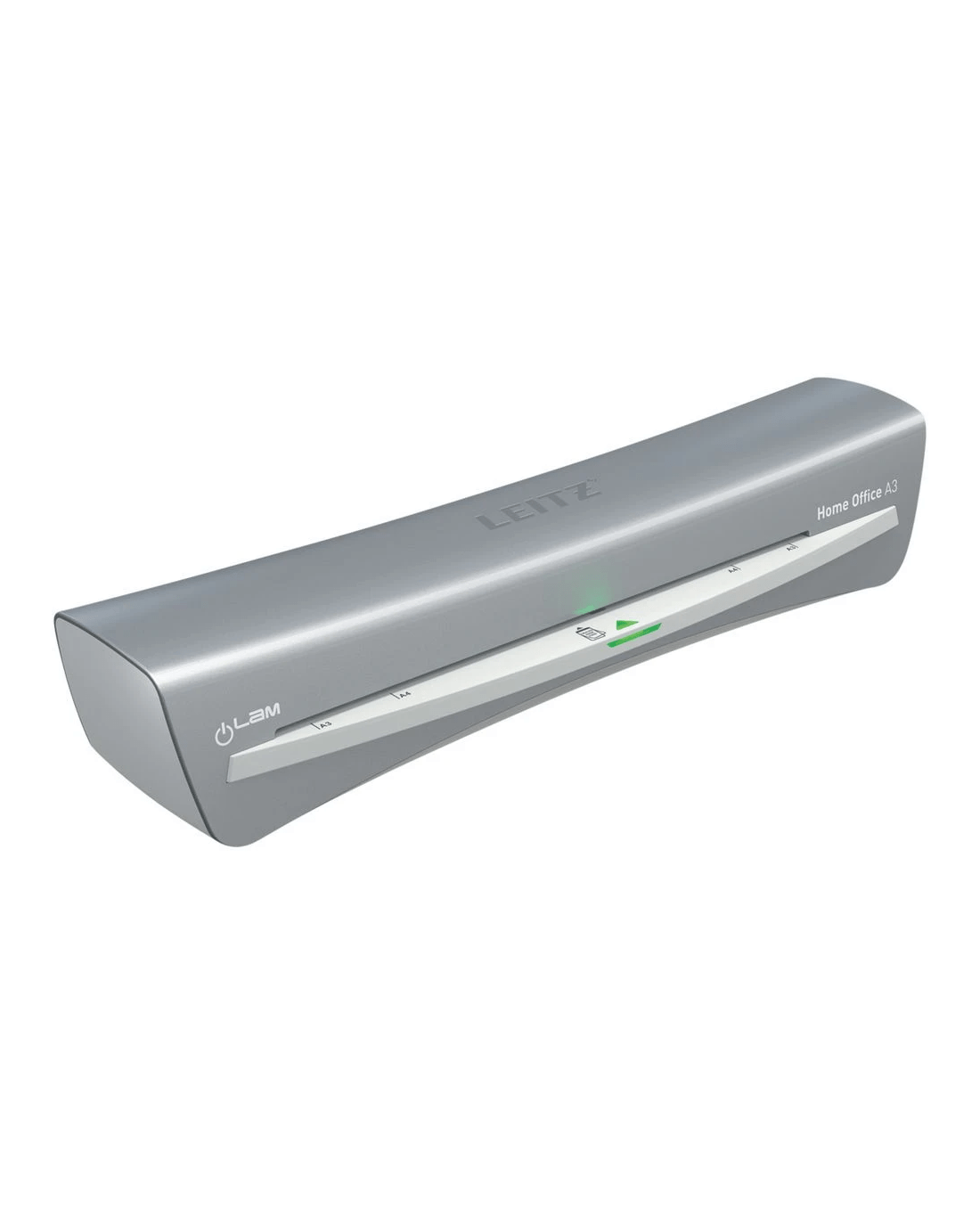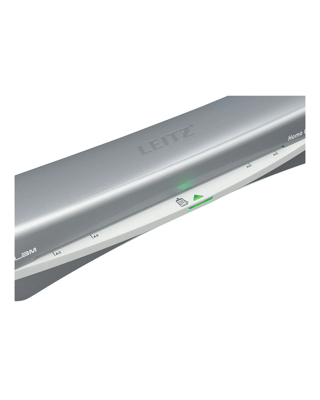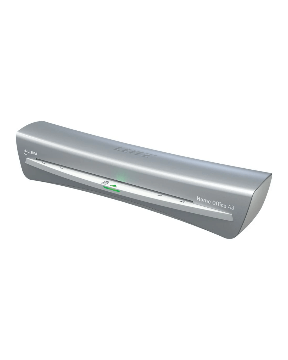 The Leitz iLAM Home Office A3 laminating machine ensures quick and easy document protection and effortless lamination. It features a fast 2-minute warm up time and the ability to laminate an 80-micron A4 sheet in just 45 seconds. Plus, the SMART status LED glows red during warm-up and turns green with an acoustic signal when the laminator is ready to use.