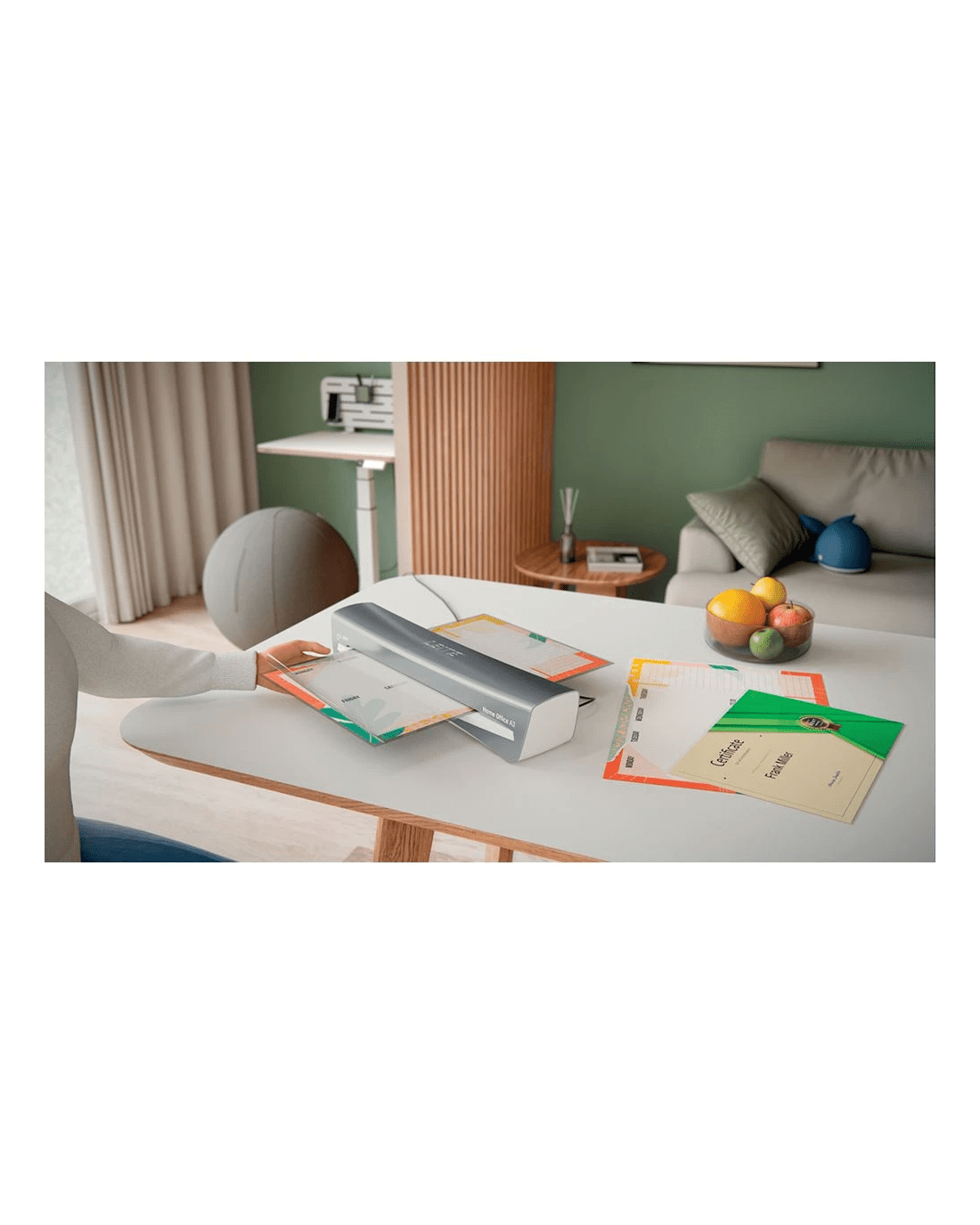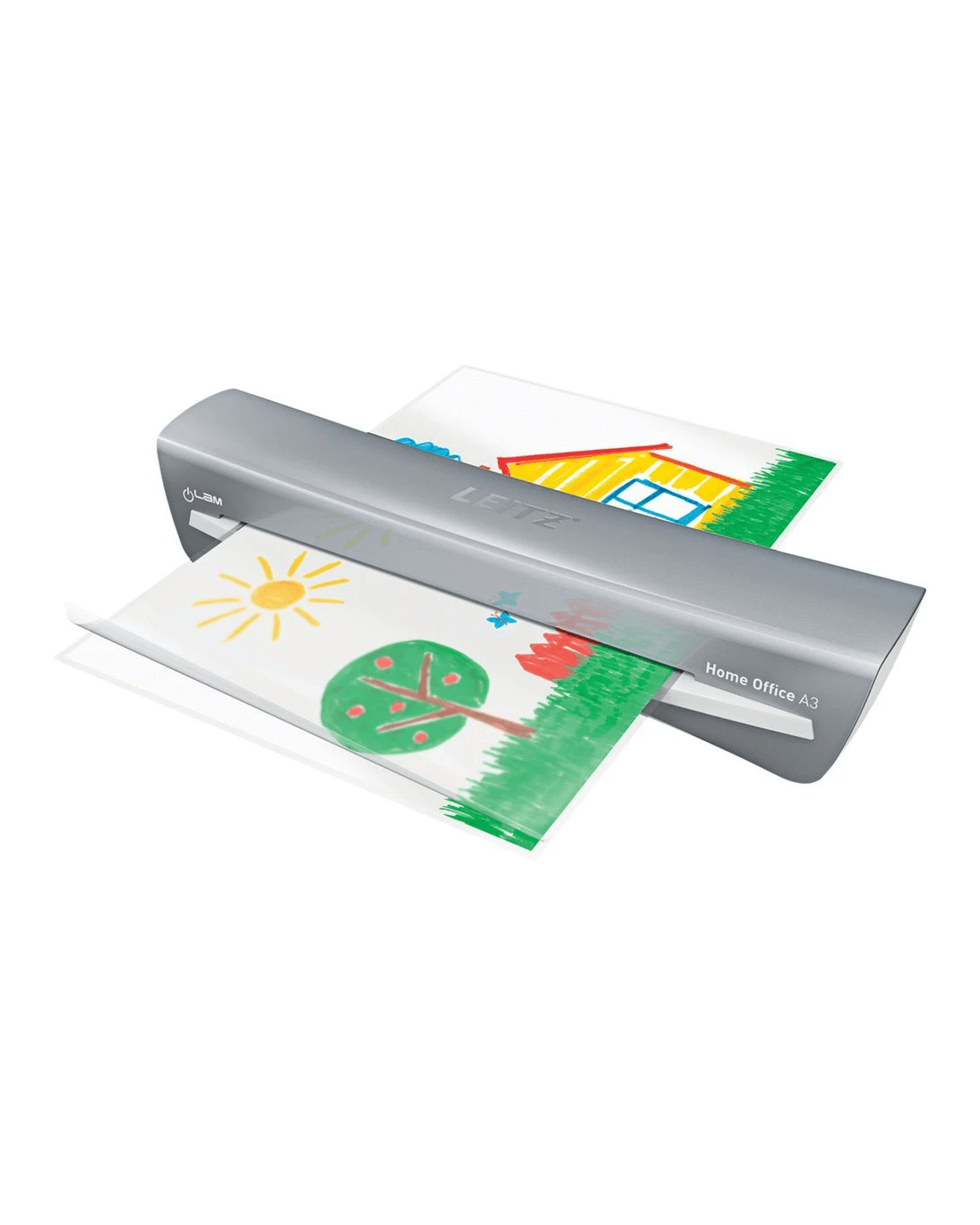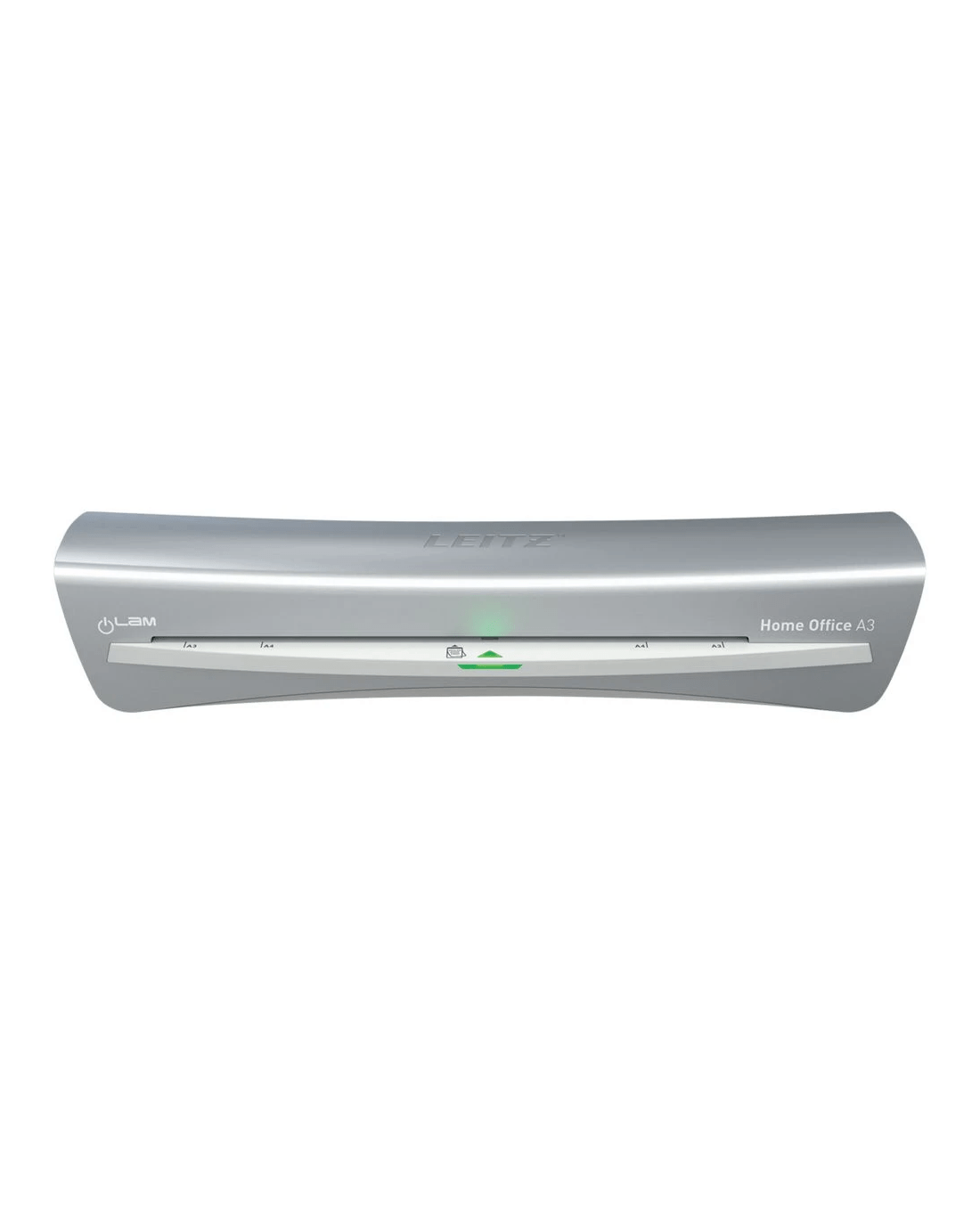 The Leitz iLAM Home Office A3 laminating machine ensures quick and easy document protection and effortless lamination. It features a fast 2-minute warm up time and the ability to laminate an 80-micron A4 sheet in just 45 seconds. Plus, the SMART status LED glows red during warm-up and turns green with an acoustic signal when the laminator is ready to use.
