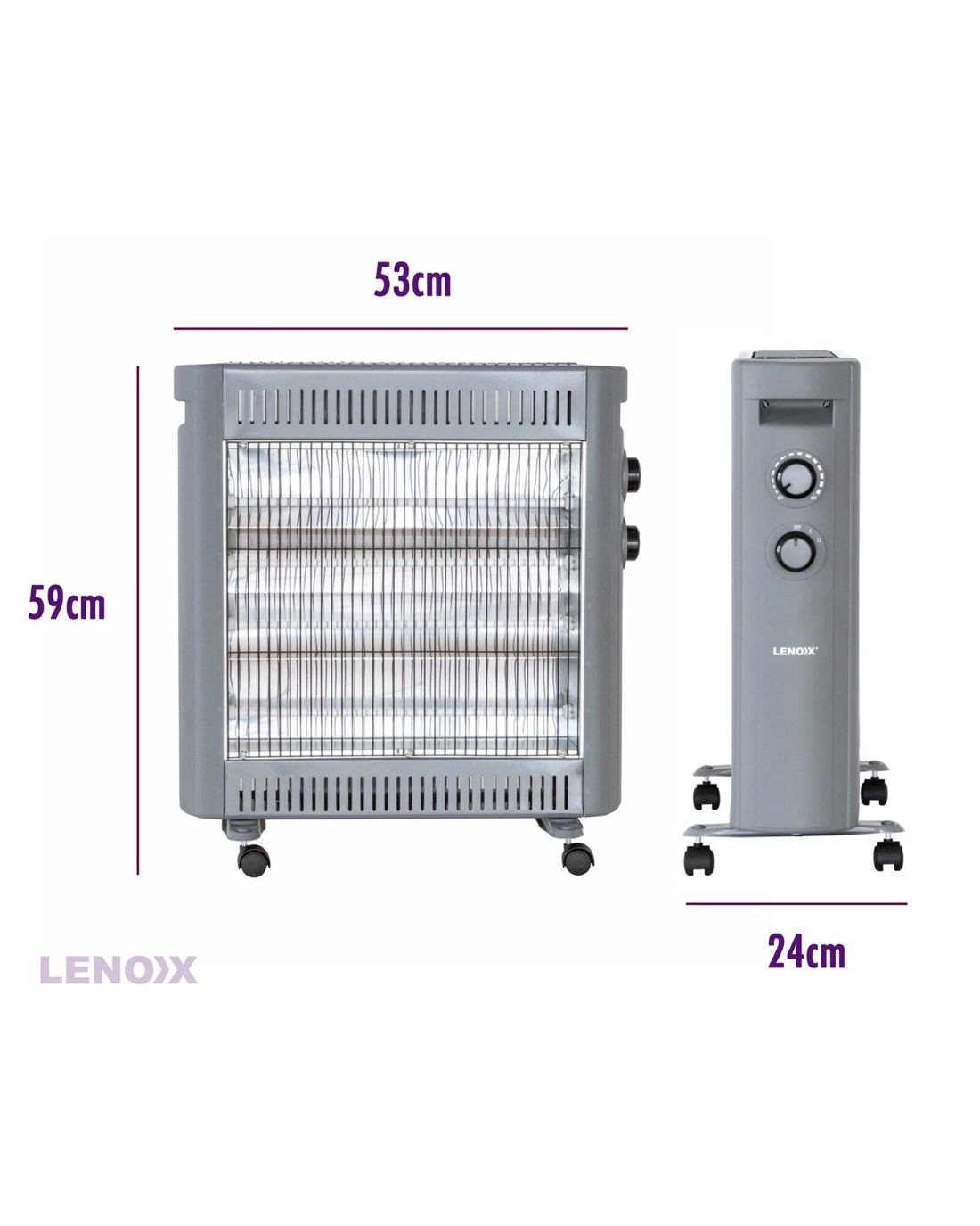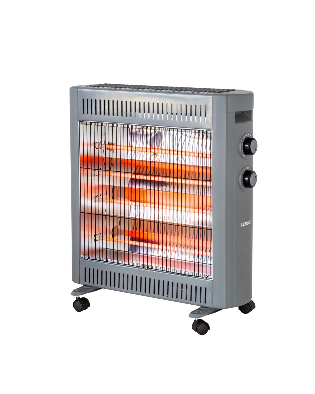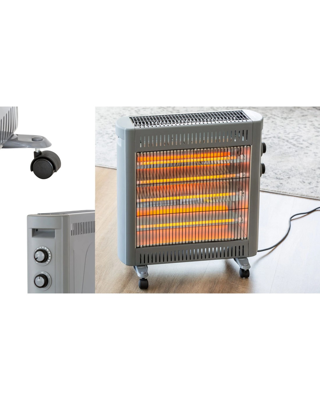 - Features: 2 power settings, adjustable thermostat, quartz heating element, free-standing on the included castor wheels, tip-over switch, overheating protection.