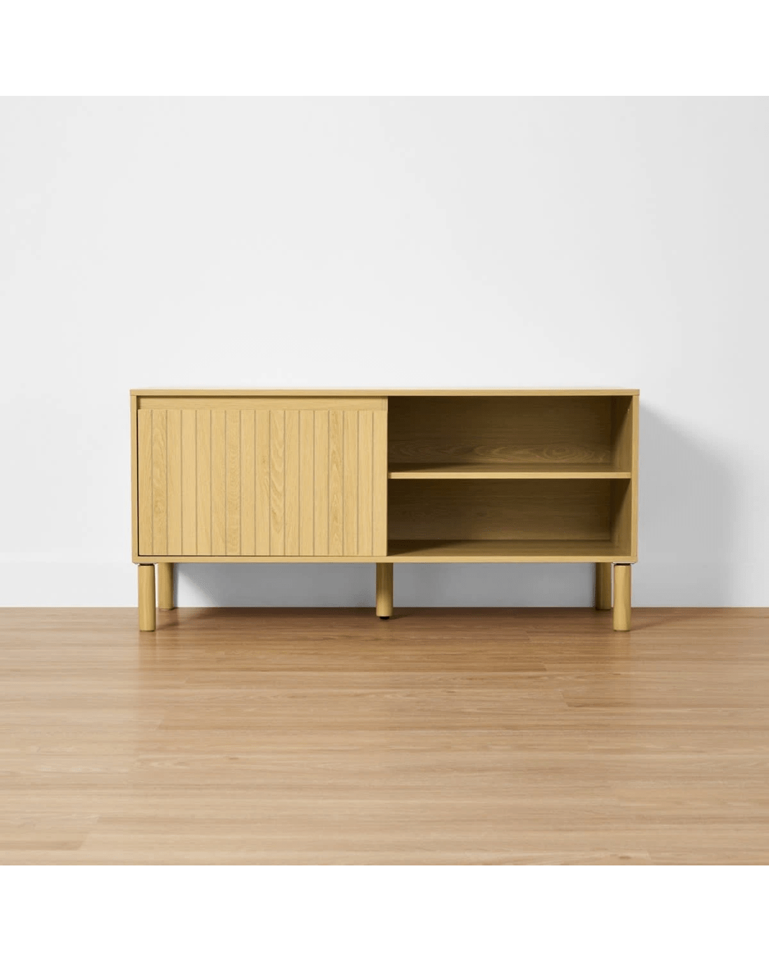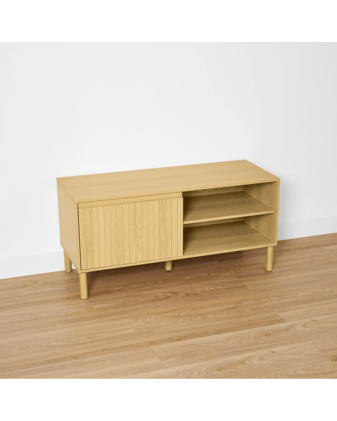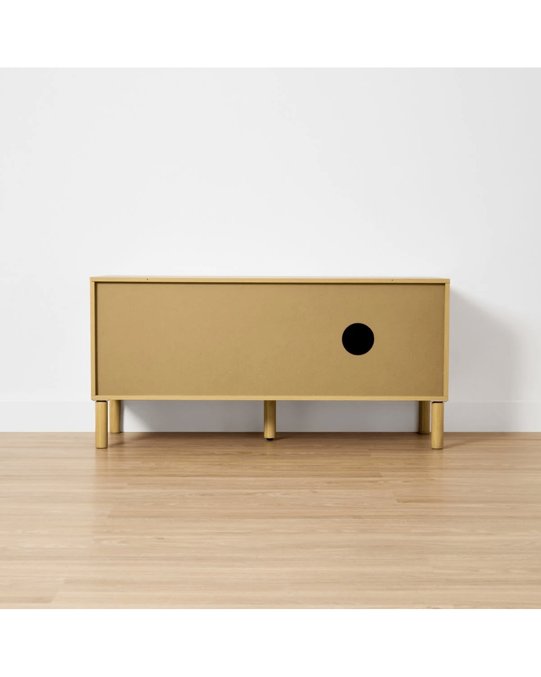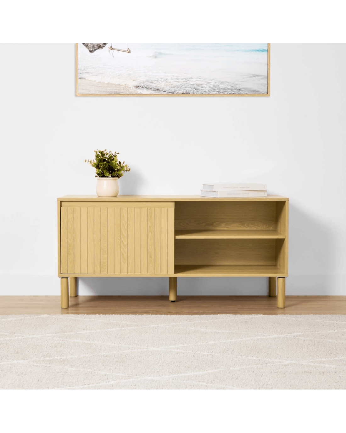 Generous Storage Option: This unit includes two spacious shelves and a concealed drawer to neatly organise media accessories, books, or decorative items.