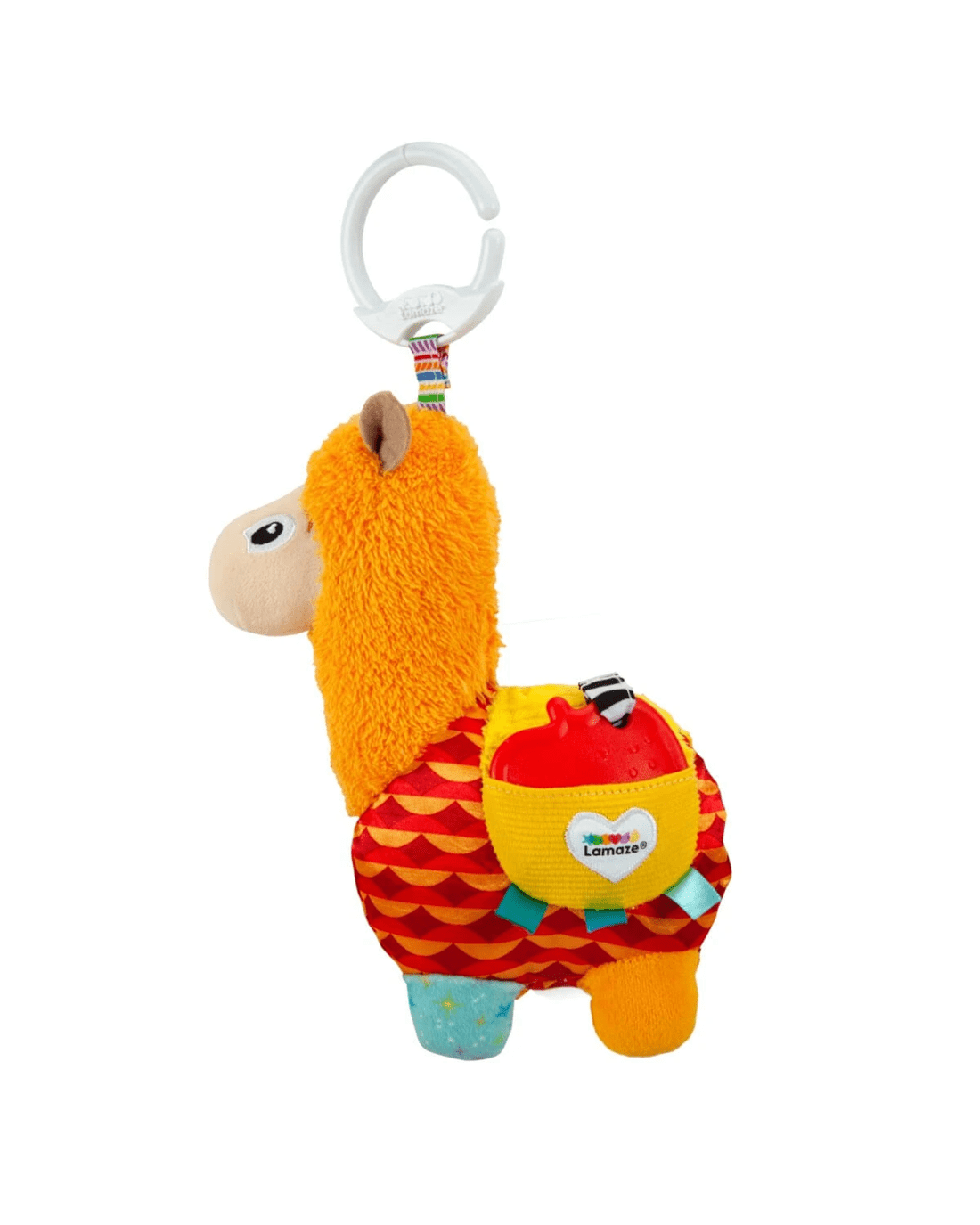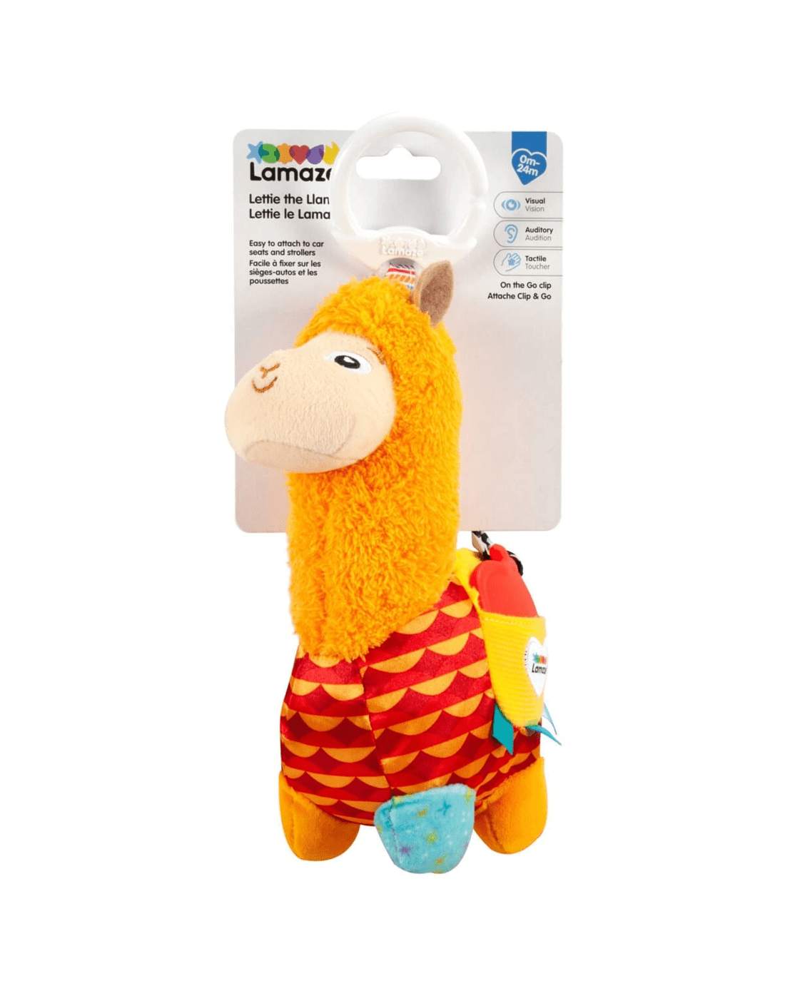 Lettie the Llama clip and go plush features multiple fabrics and textures for the baby to explore. Features include chime sounds, crinkle fabric, an apple teether, and a stroller clip for on the go.