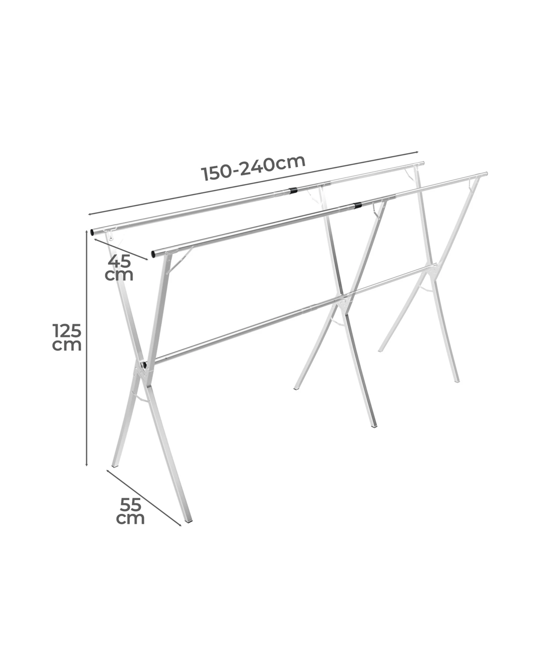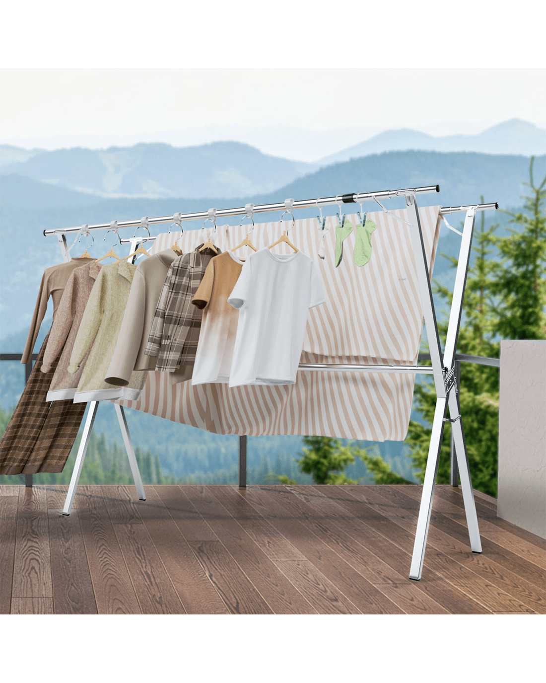 Our multifunctional clothes rack is designed with robustness and ease of use in mind. It is crafted from 201 stainless steel with galvanized accessories, ensuring long-lasting durability and corrosion resistance. Its adjustable length, ranging from 150cm to 240cm, accommodates a wide variety of clothing, making it a flexible solution to meet your drying needs.