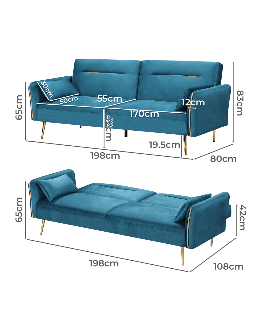 Dimensions (sofa mode): 198cm x 80cm x 83cm (W x D x H)