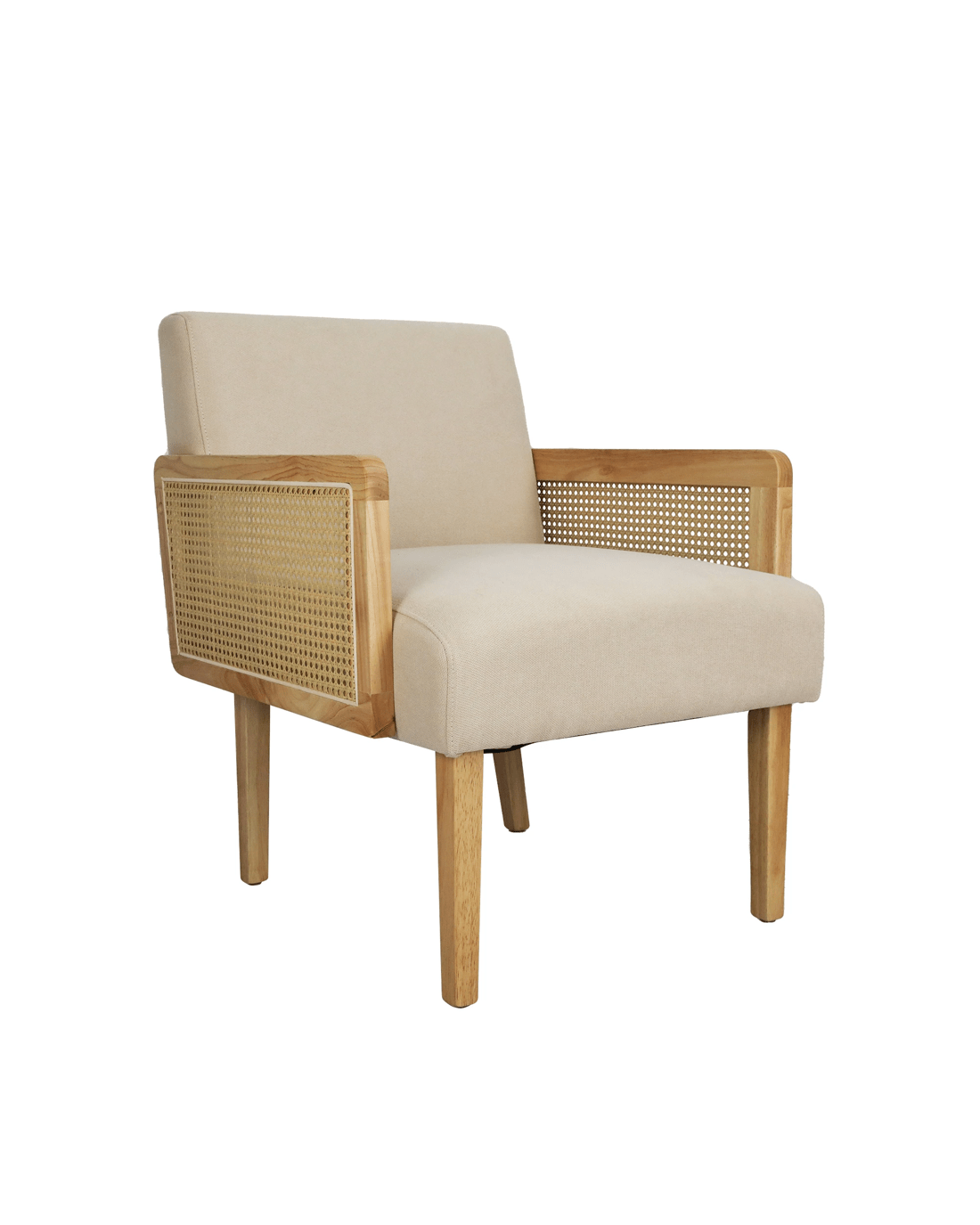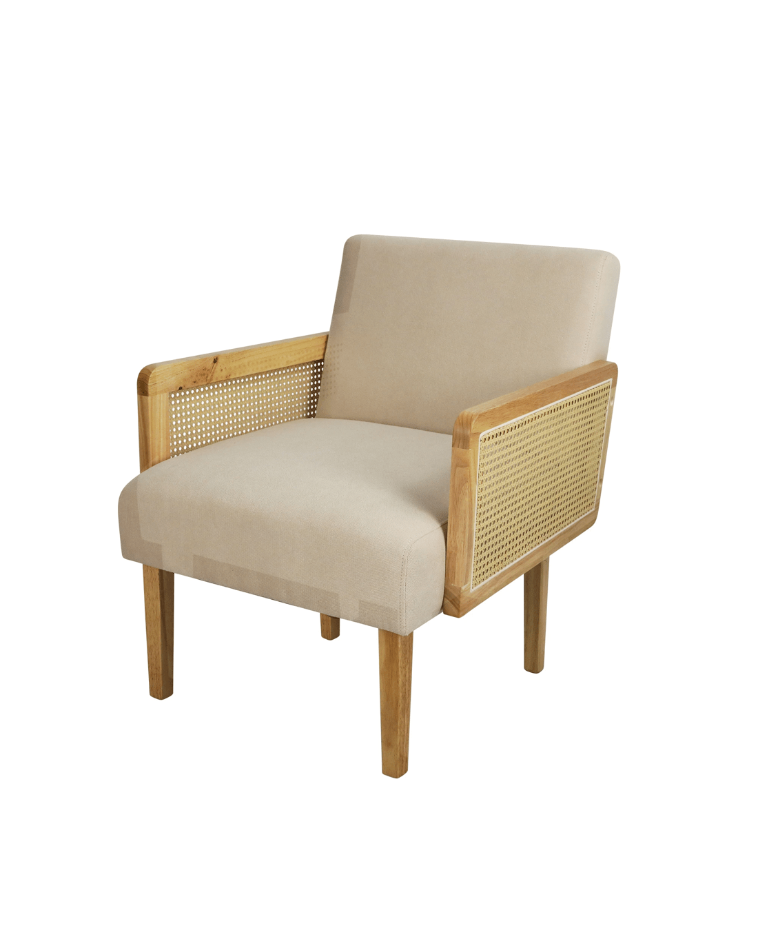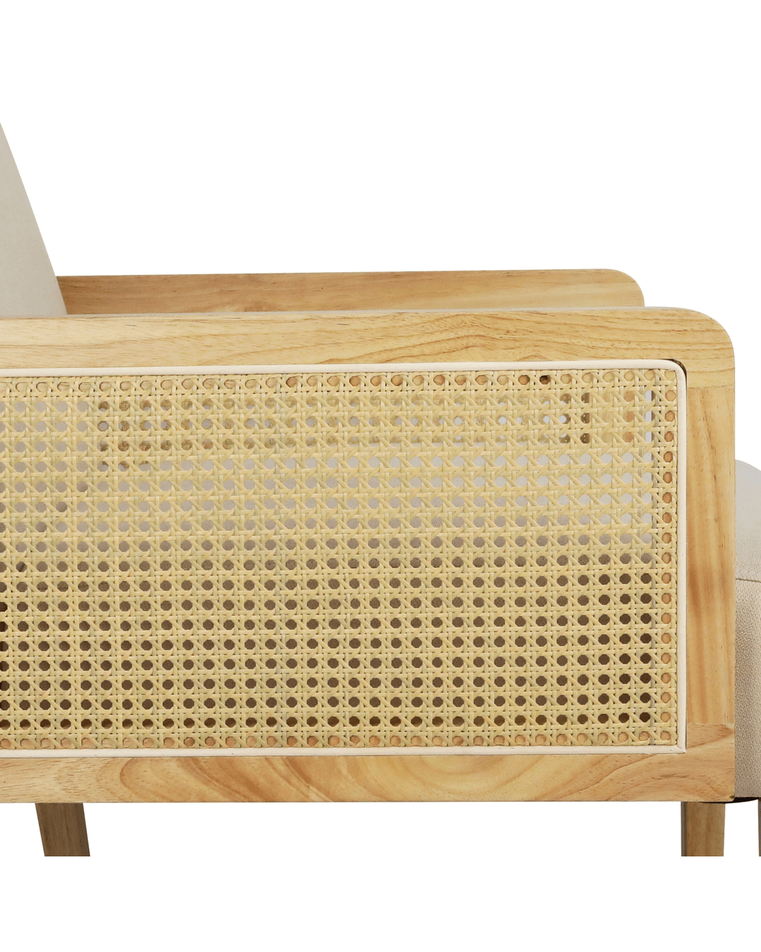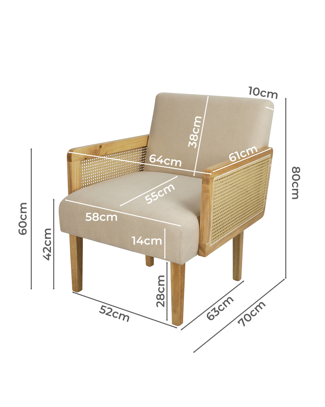 Material: Rubber wood, PE rattan, Polyester linen fabric, 50D foam
