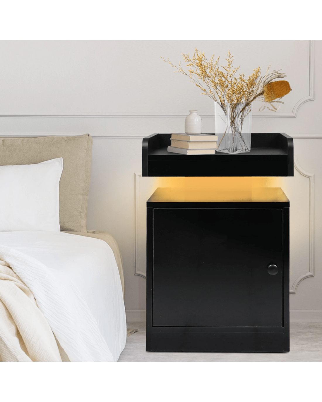 Transforming your bedtime experience into a serene ritual is effortless with our Levede bedside table featuring integrated LED lighting and practical functionalities.