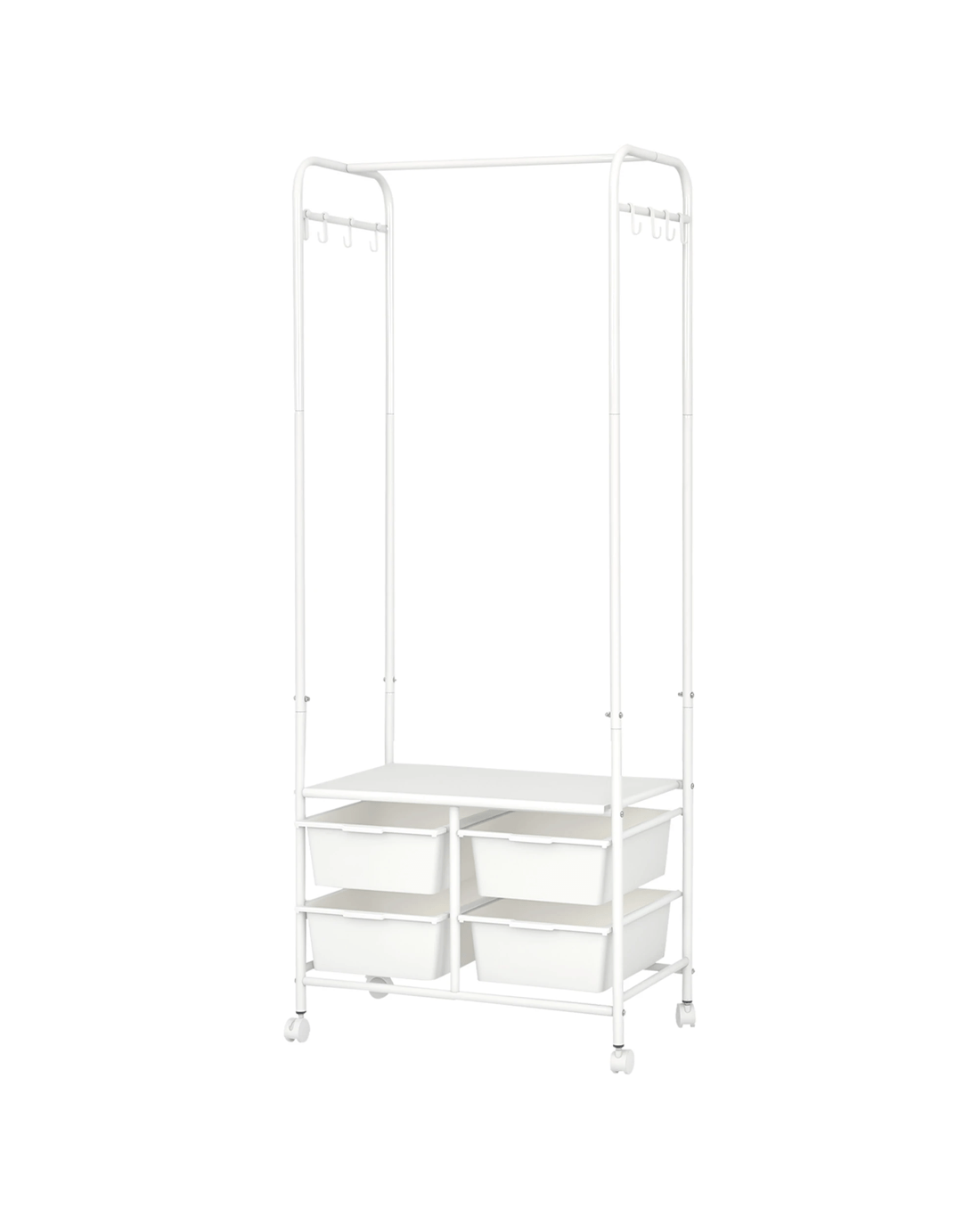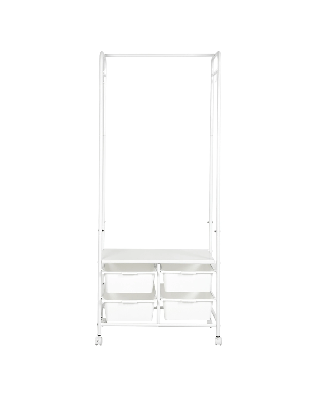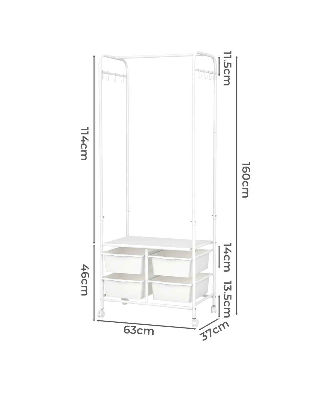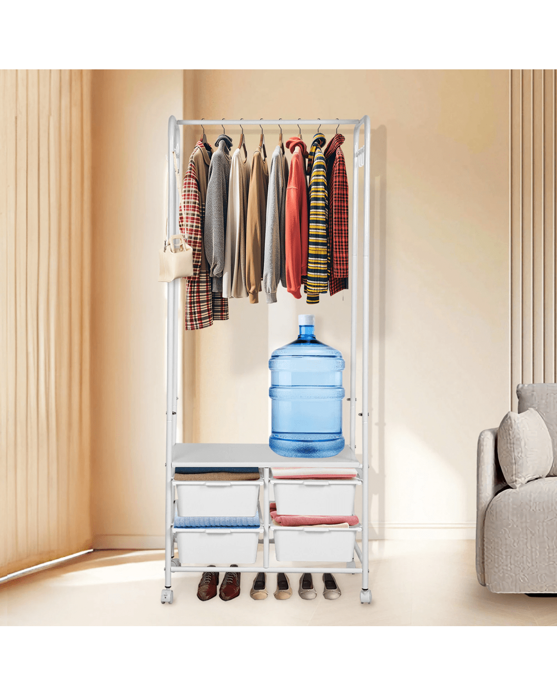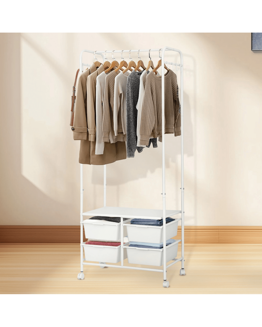 Say goodbye to clutter and hello to organized style with our all-in-one clothes rack! This sleek and sturdy wardrobe rack is designed to make your life easier—featuring a horizontal bar to hang your clothes, 4 handy storage boxes, and 6-8 side hooks for accessories. Need extra room for shoes? We’ve got you covered with a bottom shoe storage area! Not only does it have a strong load-bearing capacity, but it also moves smoothly on silent wheels with brakes, so you can easily roll it around and keep it in place. With rounded edges for safety and a design that’s both aesthetic and practical, this is the perfect addition to any room. Enjoy large capacity, easy access, and a stylish touch—all in one!