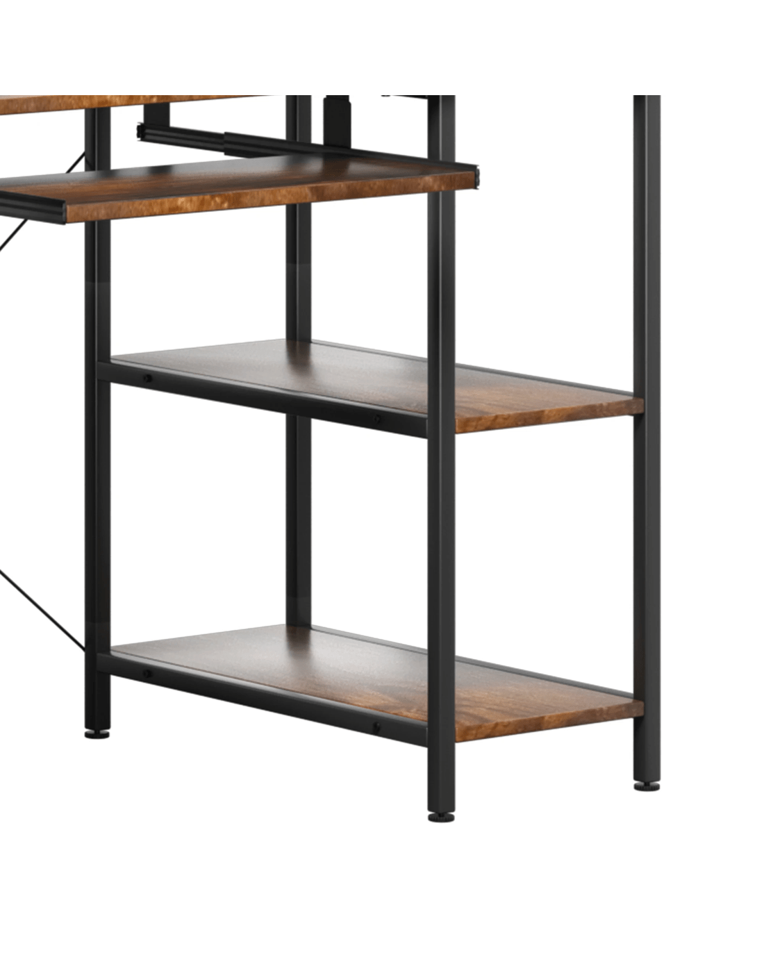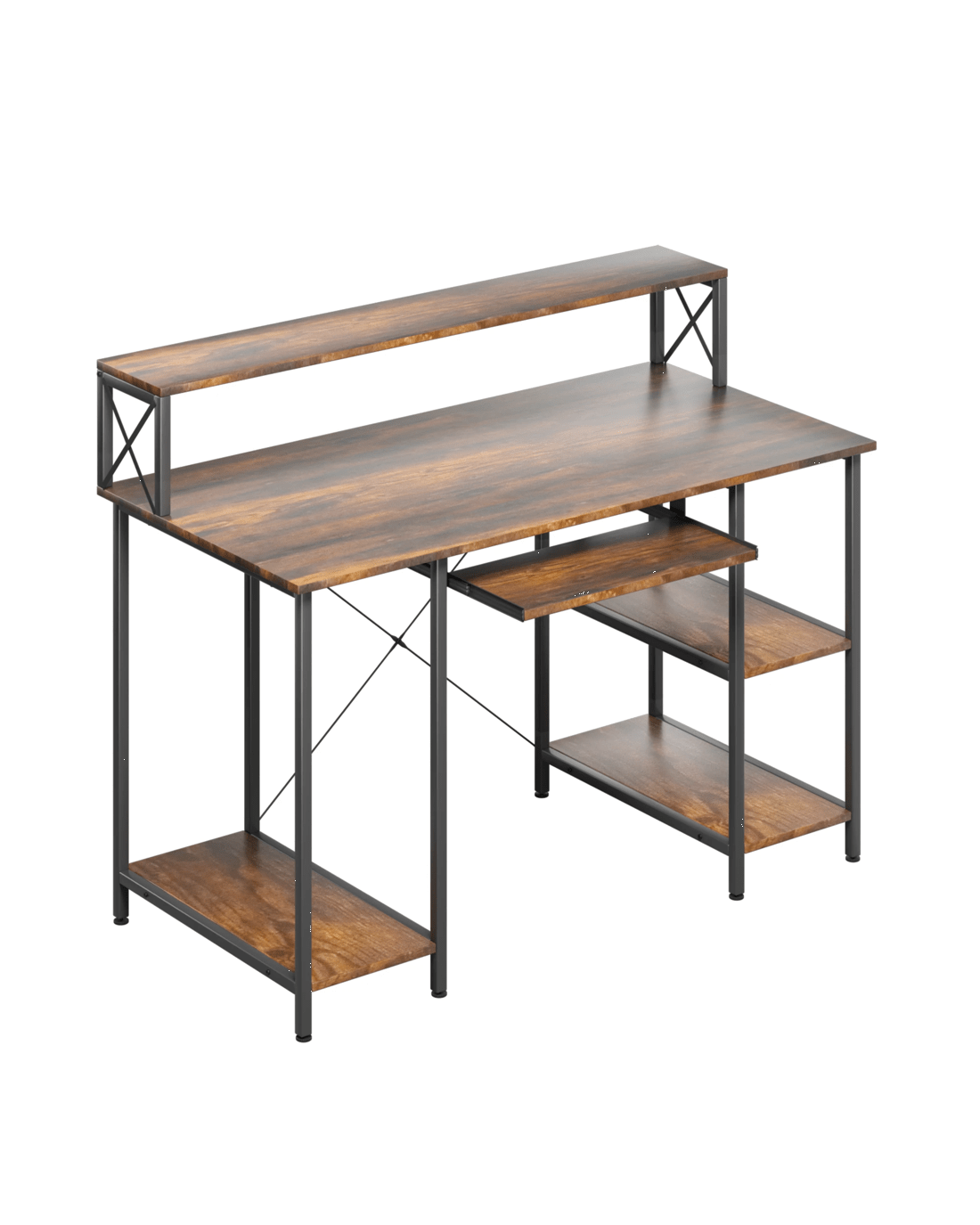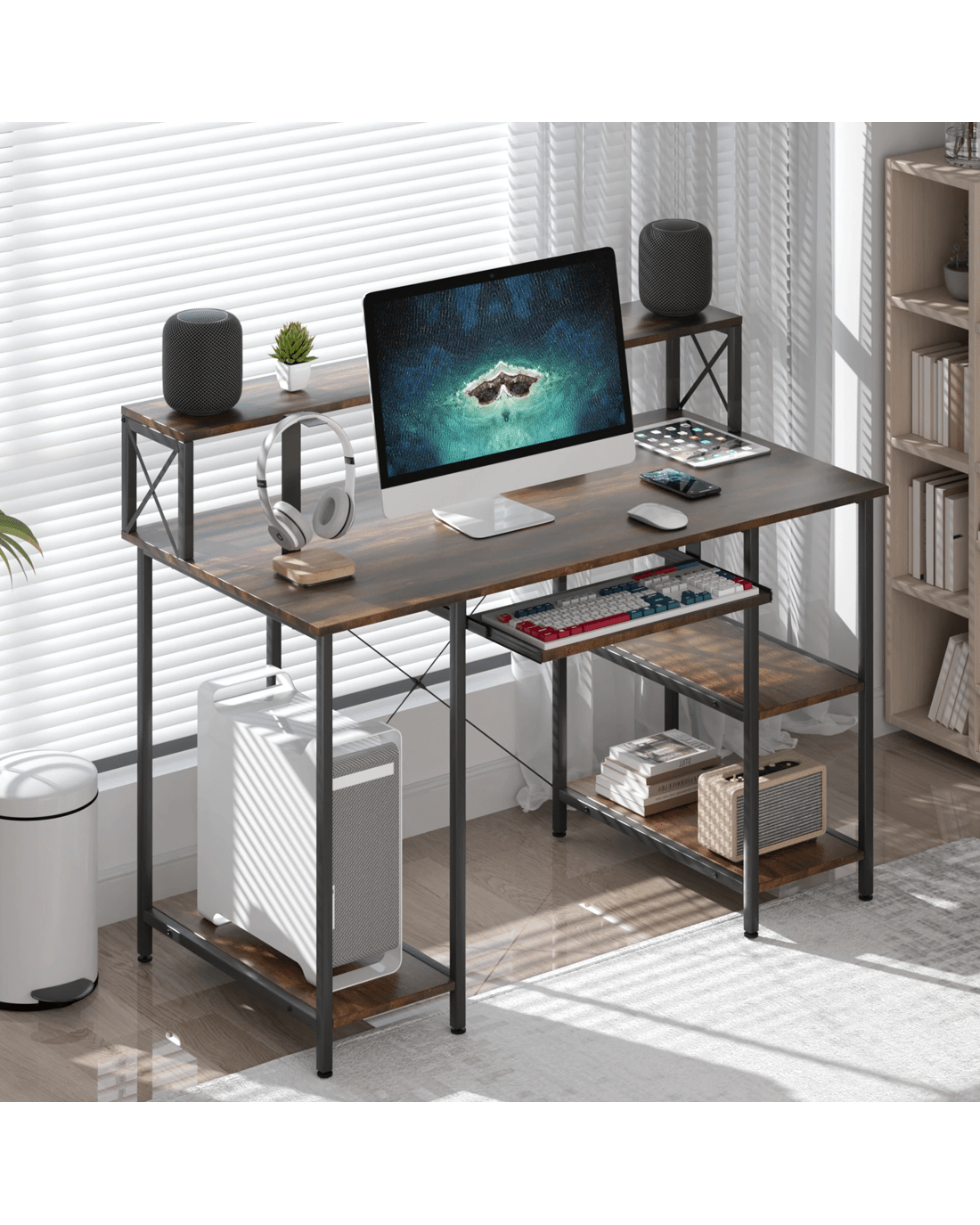 The keyboard tray, which can be smoothly pulled out, offers a convenient solution for storing your keyboard, keeping it accessible yet out of sight when not in use. The desk further boasts two layers of shelving, providing ample storage space for organizing your belongings and enhancing the overall storage capacity.