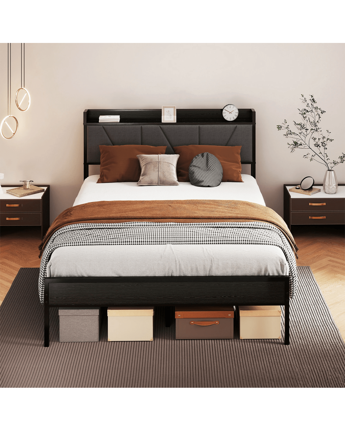 - Platform design with headboard & storage