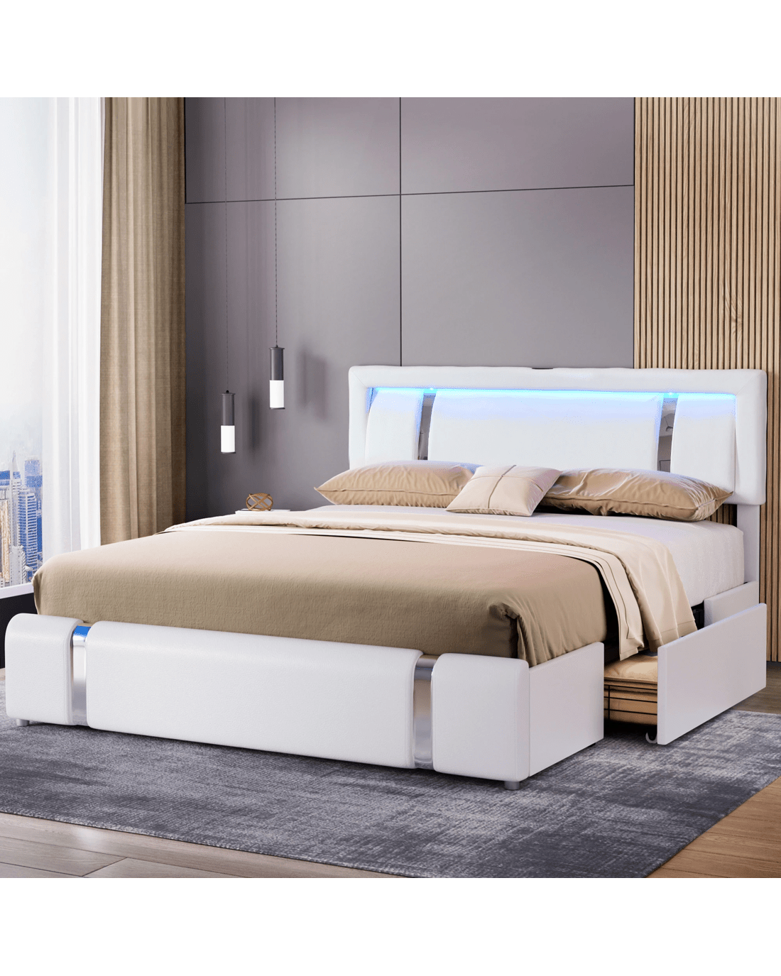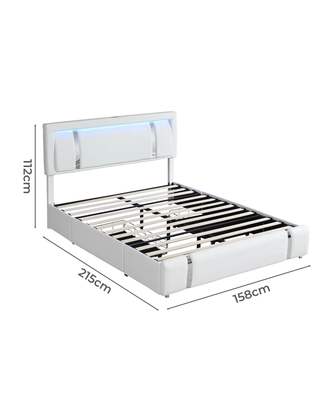 Upgrade your bedroom with the Levede bed frame, featuring a soft PU leather backrest and an adjustable-height headboard for personalized support. The integrated USB charging ports keep devices powered, while three‑sided RGB LED light strips set the perfect mood. With two spacious side drawers and durable slatted support, this Levede bed frame blends smart storage and robust construction for a restful night. Constructed from a sturdy powder‑coated steel frame, the Levede bed frame offers even weight distribution and noise‑free performance. Quick to assemble and built to last, the bed frame includes dust‑proof drawer liners and a thoughtful embedded design. Transform your space with this bed frame built for comfort, convenience, and contemporary style.