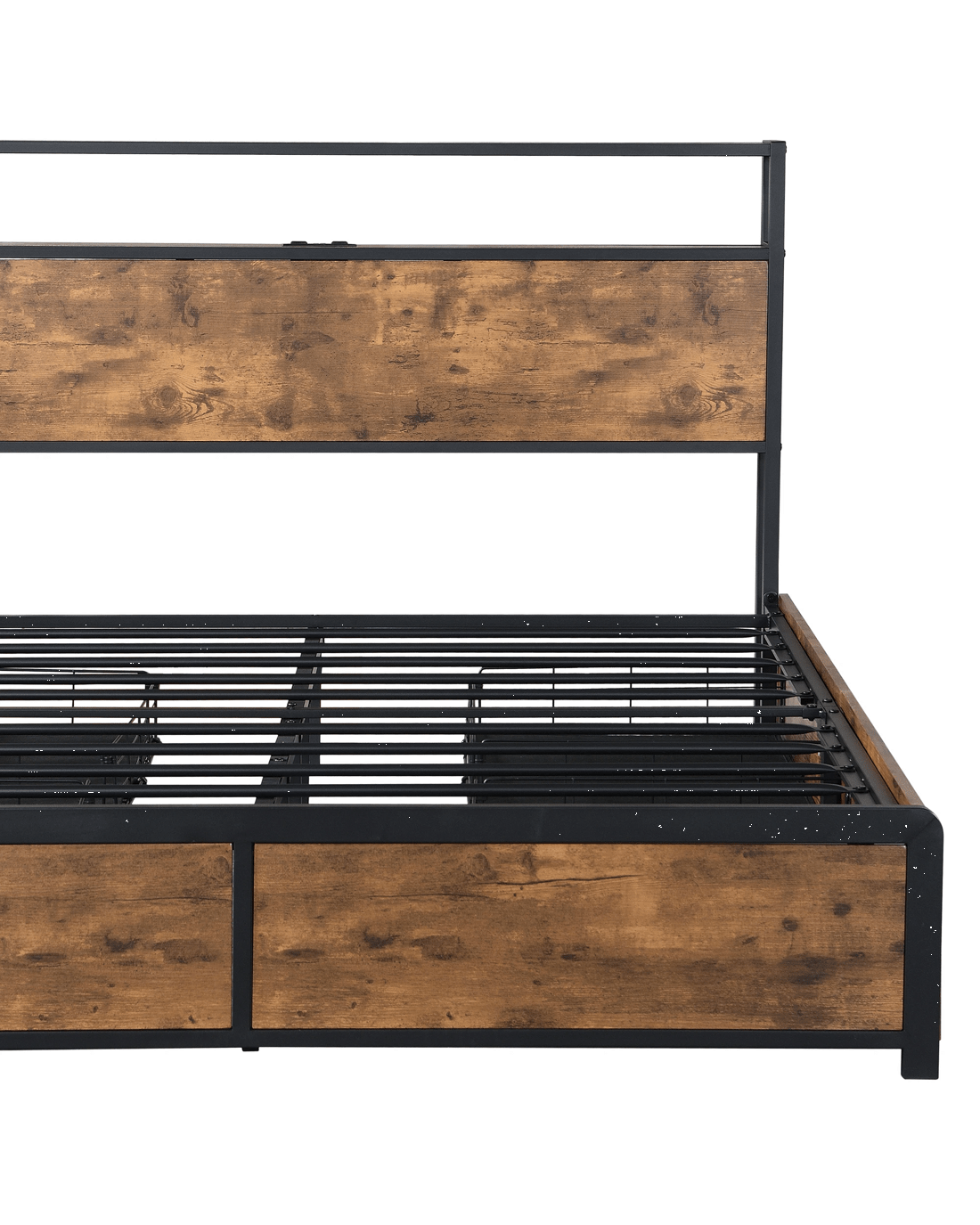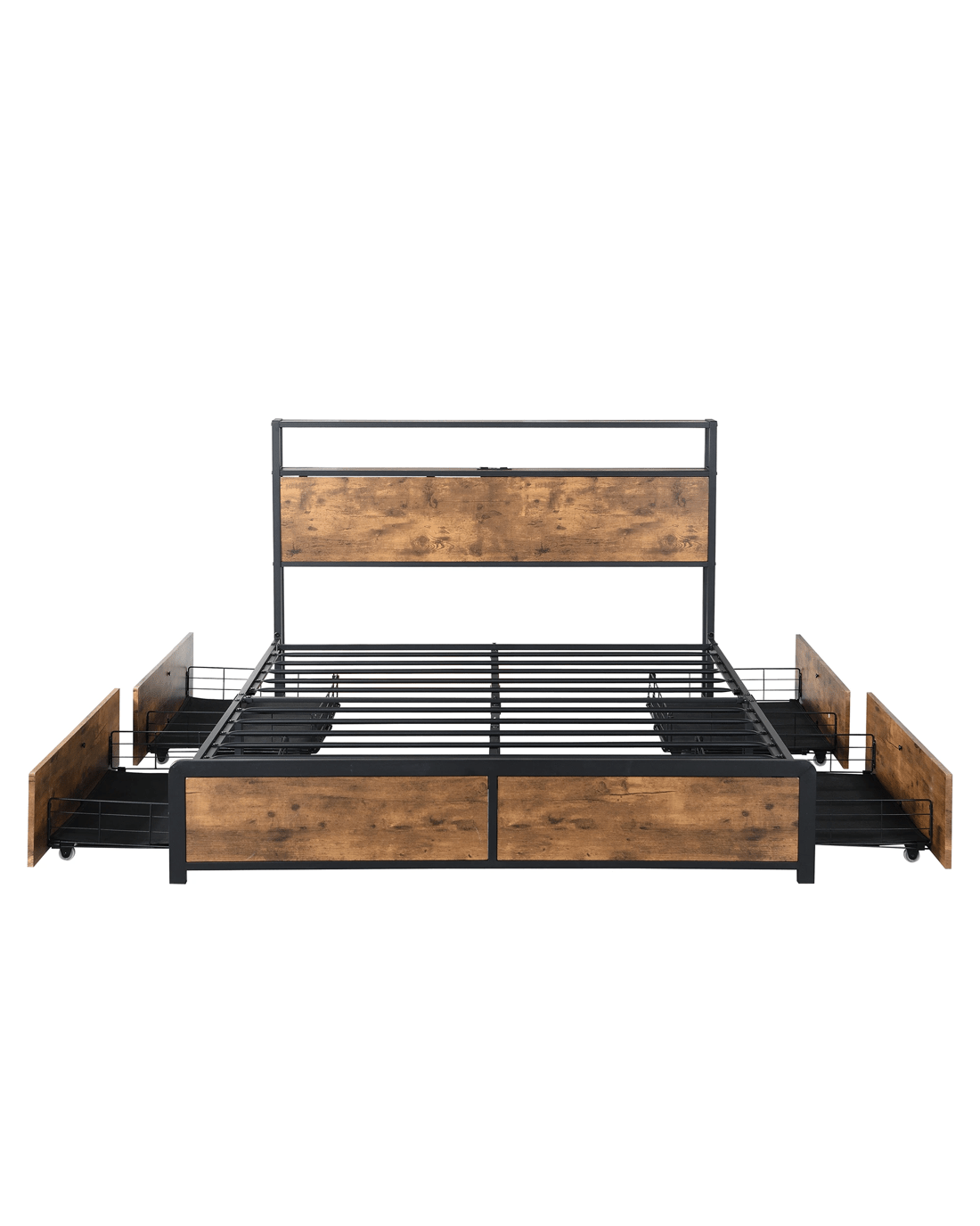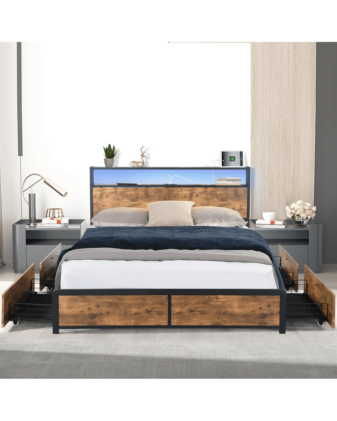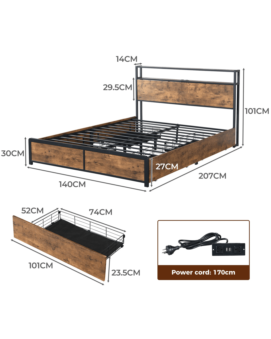 Sold by Sello ProductsLevede Double Size Industrial Bed Frame with Drawers Light and Charging Station in Dark Grey