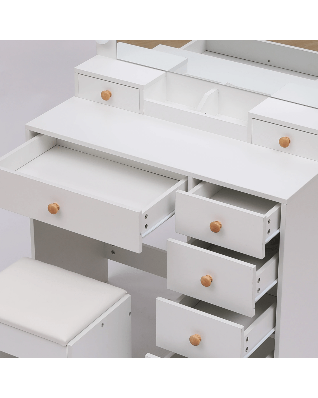 It offers abundant storage space, featuring 7 drawers and 2 open compartments, ensuring that you will never be in a messy state. The smoothly-sliding drawers provide effortless access to your makeup accessories.