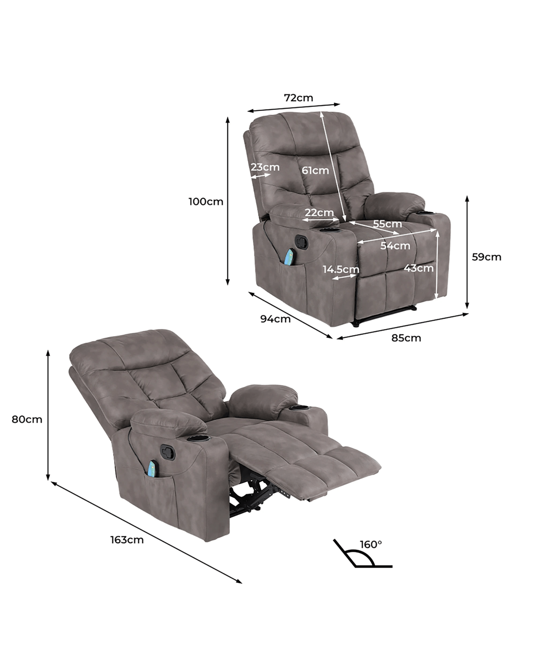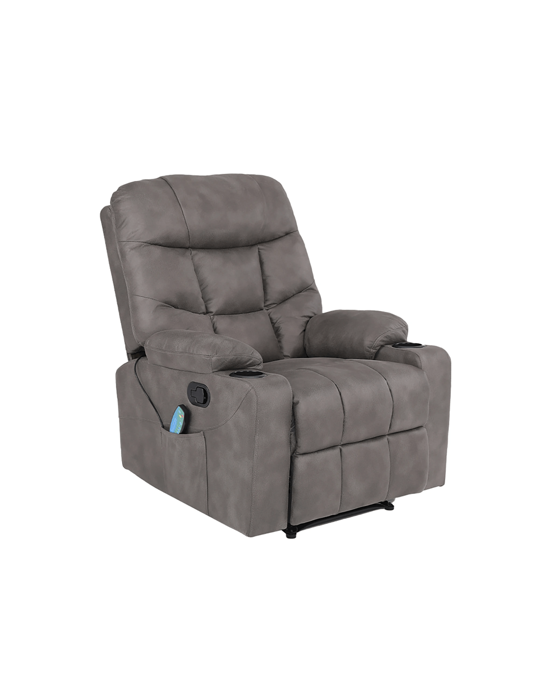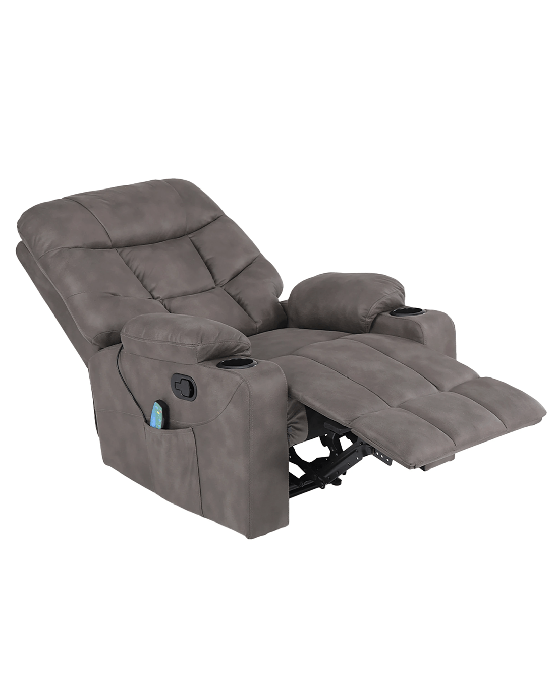 The chair reclines from 110° to 160°, letting you find your ideal position with ease. Eight massage points work in harmony to target pressure zones, while the integrated heating function enhances relaxation. With handy side pockets and dual cup holders, everything you need is right within reach—making it a practical yet indulgent lounge essential.