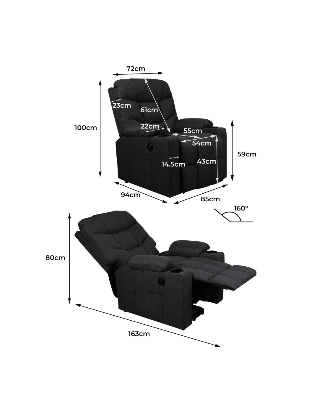 - Custom Comfort: Reclining positions adjustable between 100° and 160°.