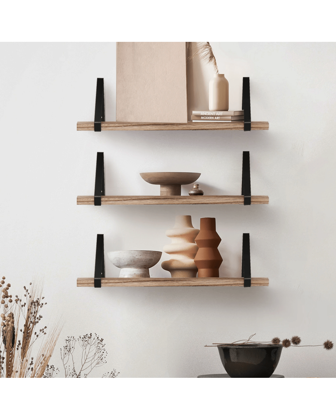 Give your walls a modern makeover with the Levede Floating Shelf set. This 3-tier wall-mounted shelf set features solid wood-look boards and strong black steel triangle brackets—perfect for adding stylish, functional storage to any room.