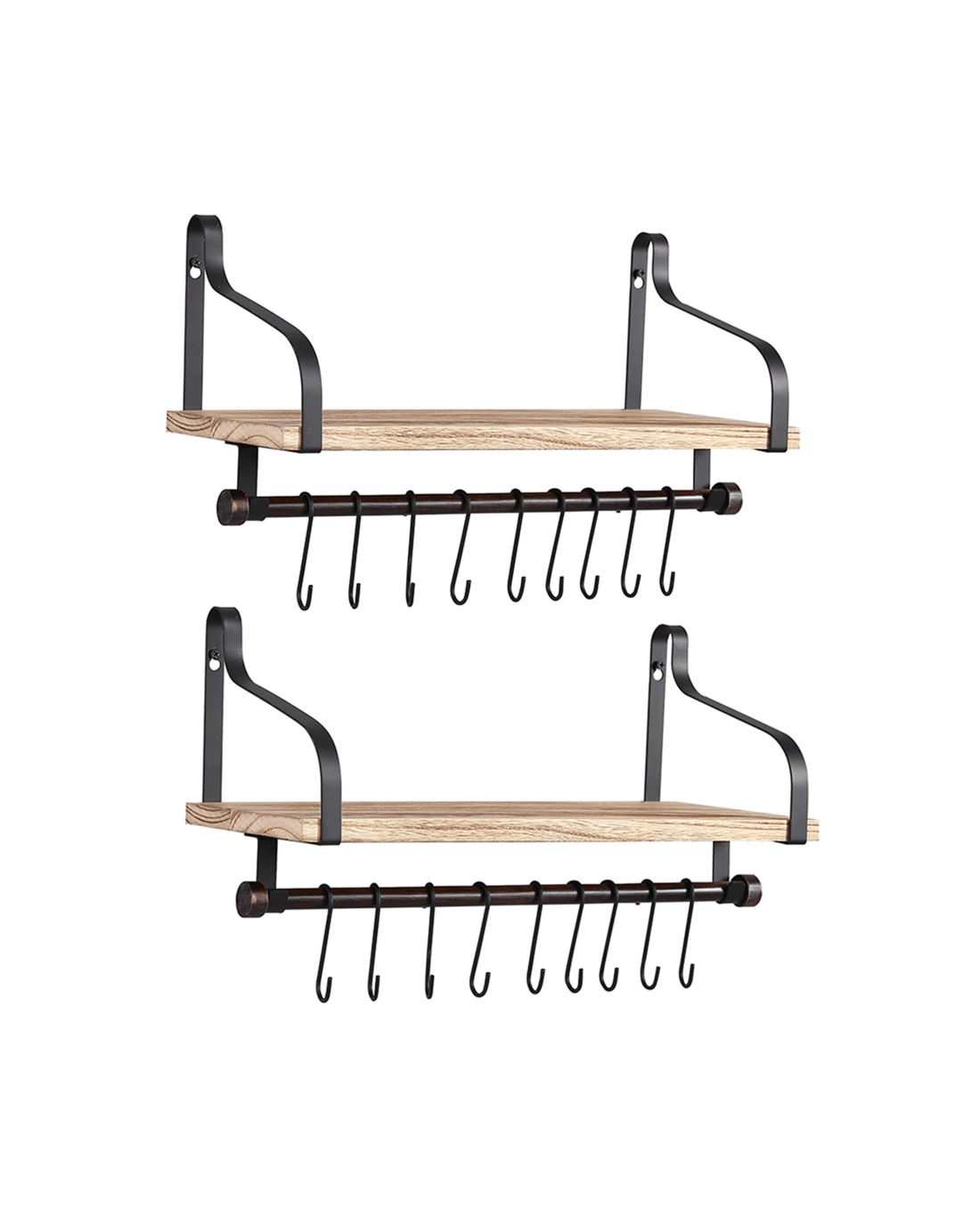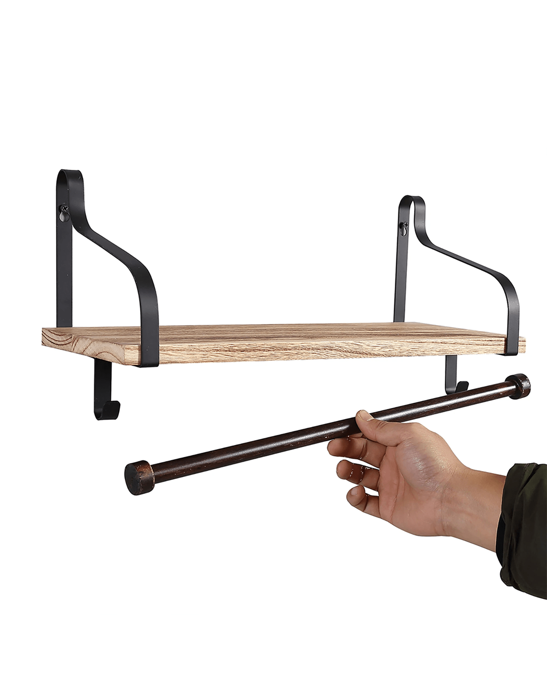 Designed for versatility, each floating shelf comes with removable hooks and a towel bar – ideal for hanging keys, mugs, coats, or utensils. The metal frame offers reliable support, while the wood shelf provides a spacious surface for your favourite books, plants, and décor.