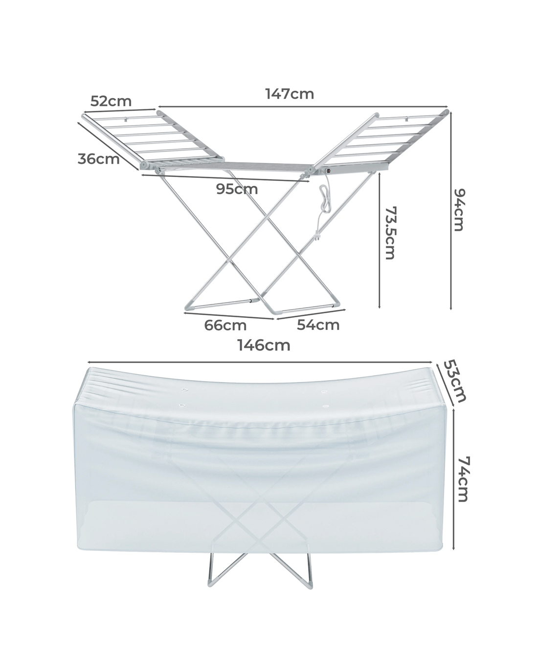 The dimensions of the Levede clothes drying rack are 147cm (L) x 54cm (W) x 94cm (H), and the heated drying rack cover measures 147cm (L) x 54cm (W) x 74cm (H). When not in use, the unit can be folded up to save valuable space in your living area.