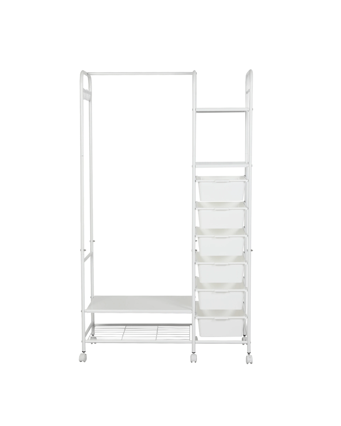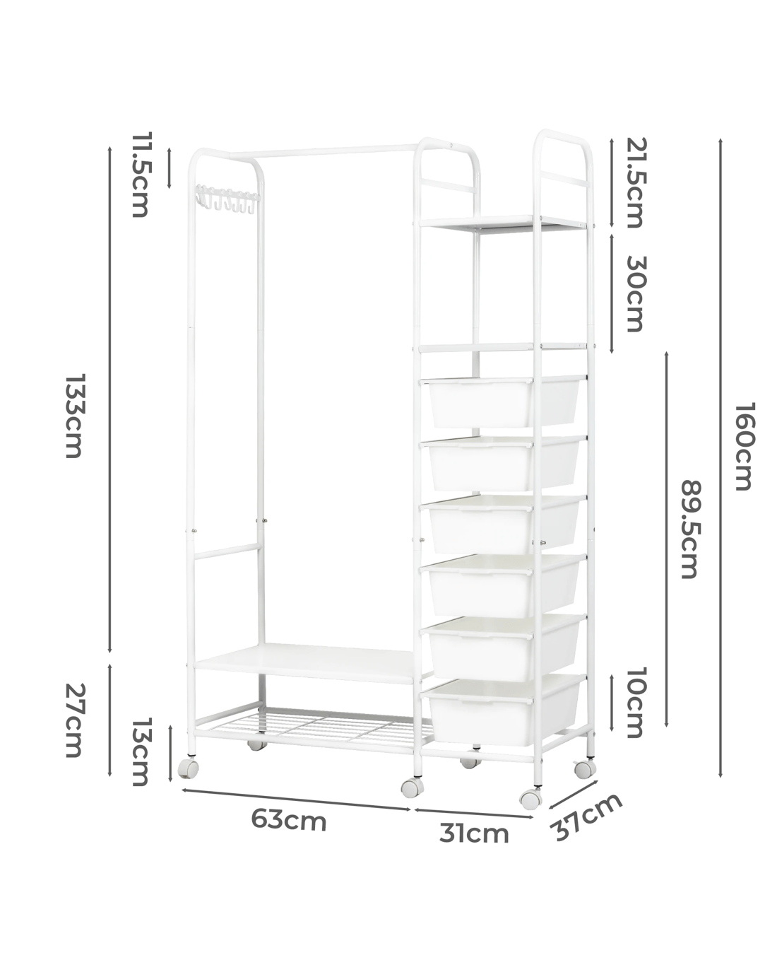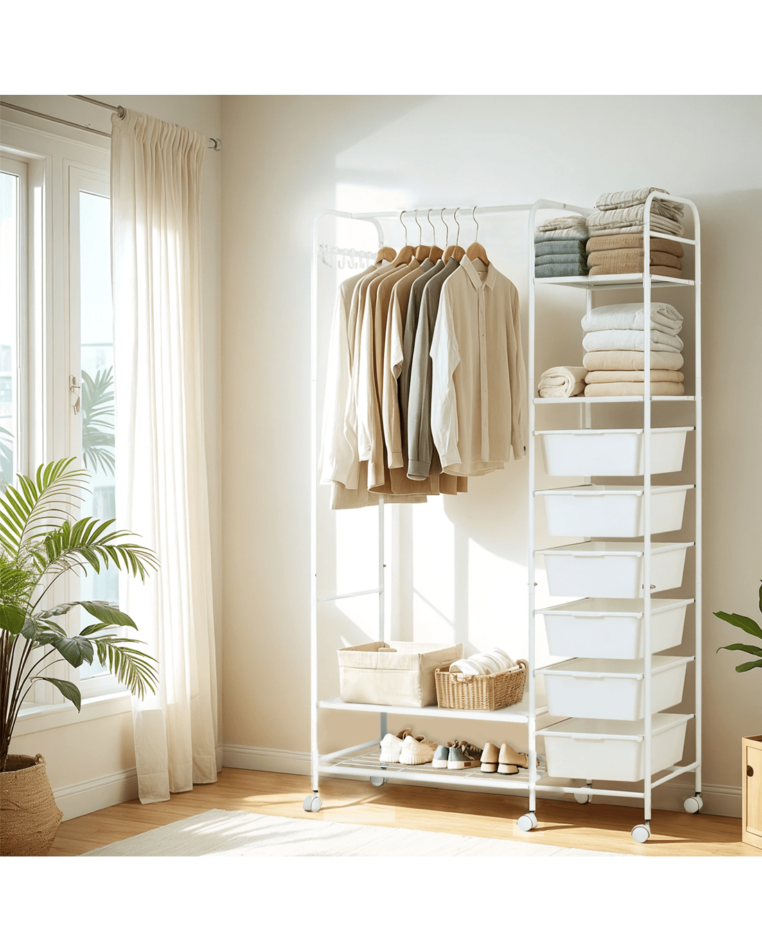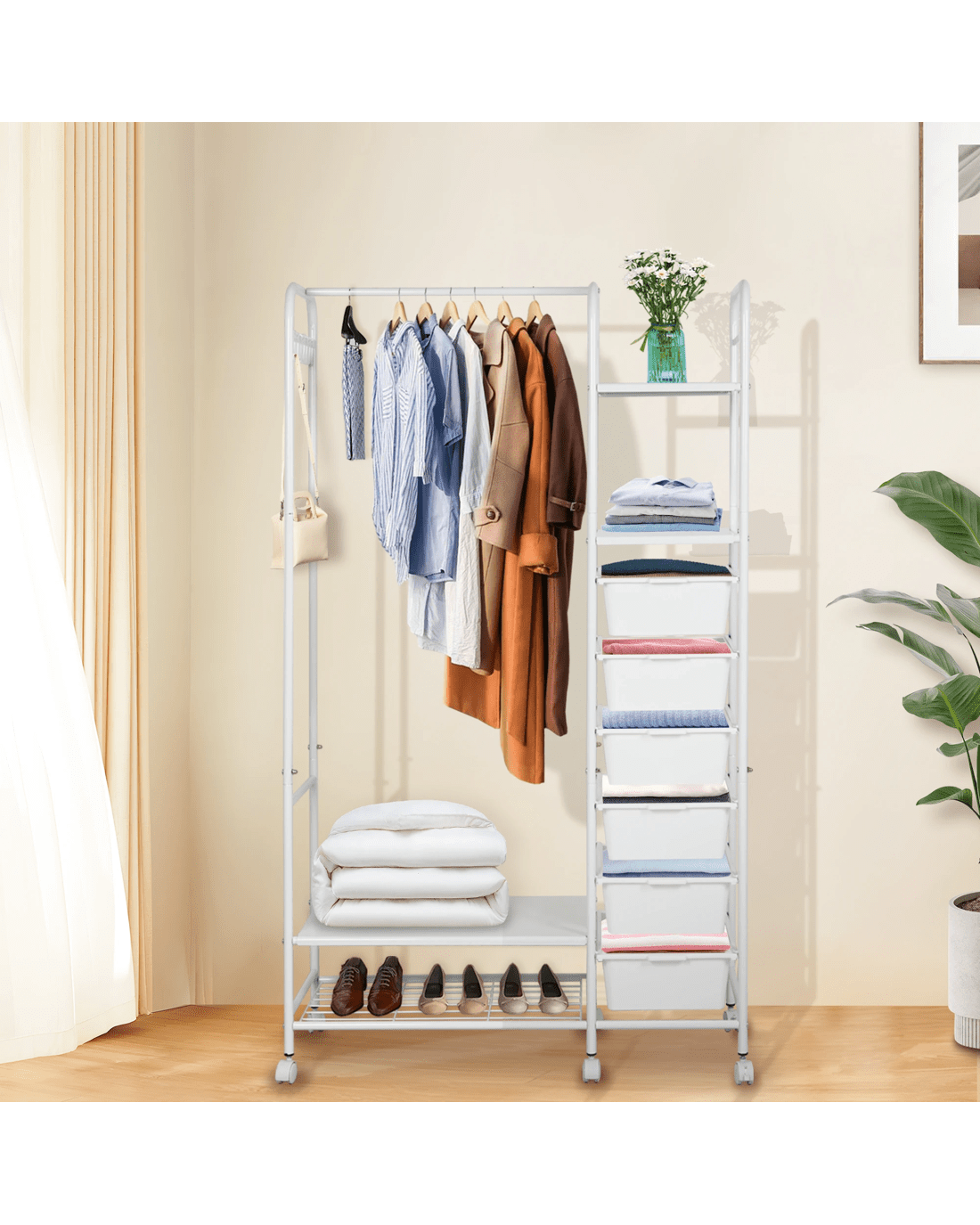 Say goodbye to clutter and hello to organized style with our all-in-one clothes rack! This sleek and sturdy wardrobe rack is designed to make your life easier—featuring a horizontal bar to hang your clothes, 4 handy storage boxes, and 6-8 side hooks for accessories. Need extra room for shoes? We’ve got you covered with a bottom shoe storage area! Not only does it have a strong load-bearing capacity, but it also moves smoothly on silent wheels with brakes, so you can easily roll it around and keep it in place. With rounded edges for safety and a design that’s both aesthetic and practical, this is the perfect addition to any room. Enjoy large capacity, easy access, and a stylish touch—all in one!