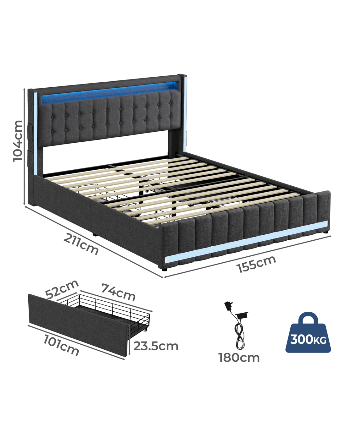 Redesign your sleep sanctuary with this sleek and functional Queen Bed Frame—where smart storage meets modern design. Crafted for both comfort and utility, it’s perfect for those who want more than just a place to sleep. From mood-setting RGB LED lights to hidden drawers and built-in charging ports, this queen bed frame transforms your bedroom into a hub of convenience and style.