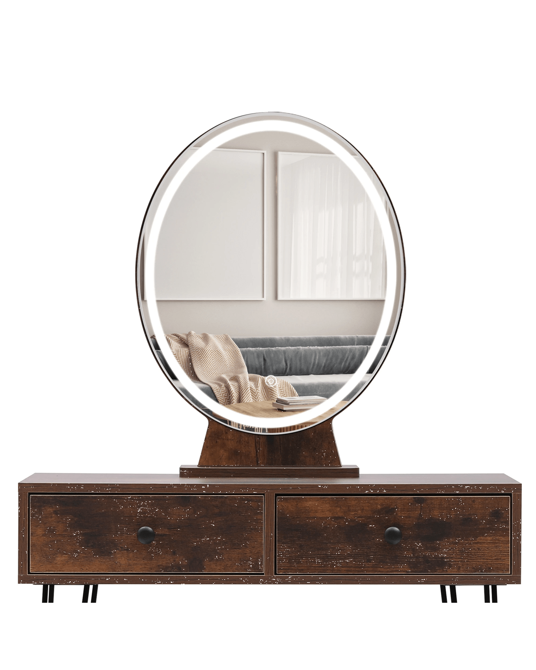 The dressing table is made of E1 grade environmentally friendly particle board. The mirror is a high-definition mercury mirror with intelligent LED lights. The legs of the table and stool are made of metal materials, which are sturdy and durable.