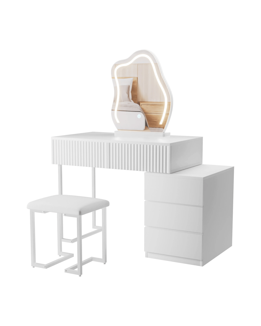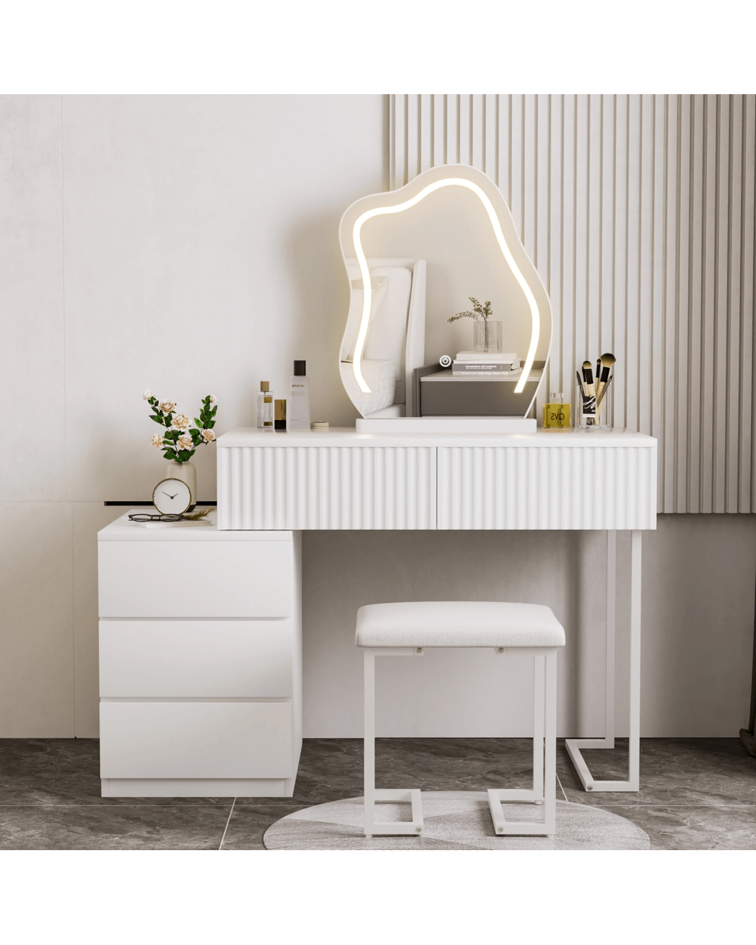 The dressing table with mirror includes ample drawer storage for your cosmetics, skincare, and accessories, while the movable cabinet gives you added flexibility. Built with smooth slides and a high-definition mercury mirror, this setup combines premium function with modern flair. Paired with a cushioned PU padded stool and generous legroom, it’s ideal for daily routines in style and comfort.