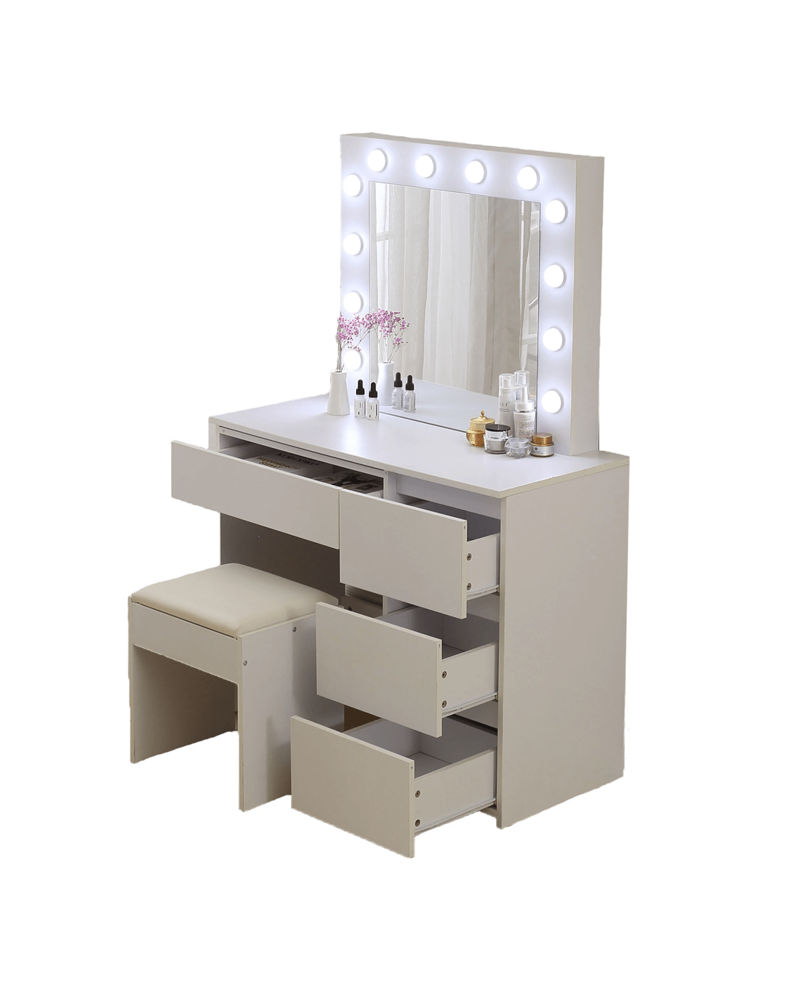 • PU-Padded Stool: Designed for comfort, making your beauty routine more enjoyable.