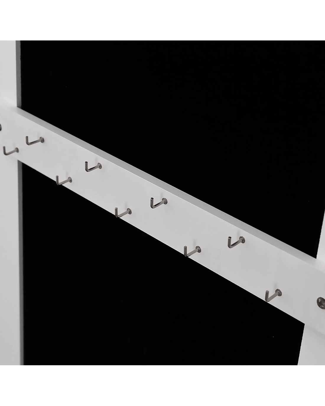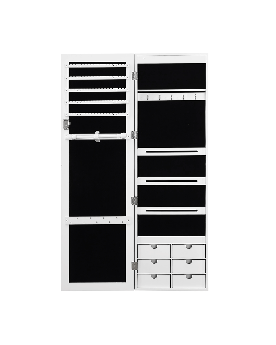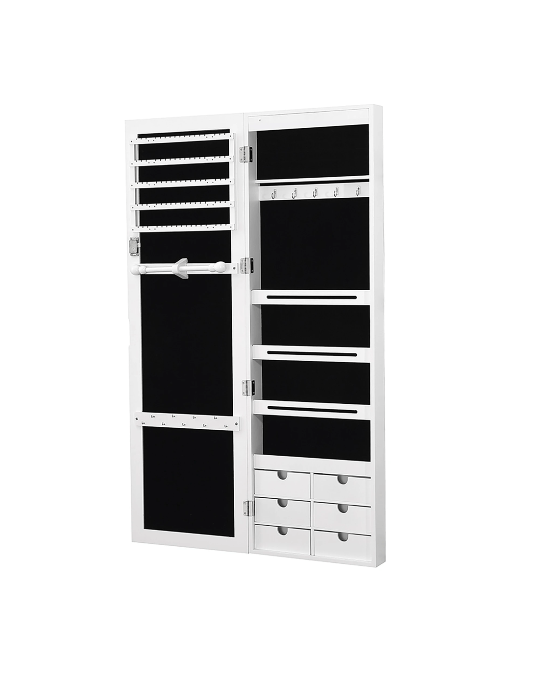 It's not only a full-length mirror, but also a Jewellery Cabinet. It's a true reflection of beauty! It can be wall mounted if space is limited. And it can also hang on the door. The classic design works well with any style of bedroom. Open it and it's a beauty wonderland. You'll find ample storage space for your jewellery pieces with slots for earrings and rings, hooks for necklaces, rod for scarf, pouches for cosmetic brushes, shelves for various items.