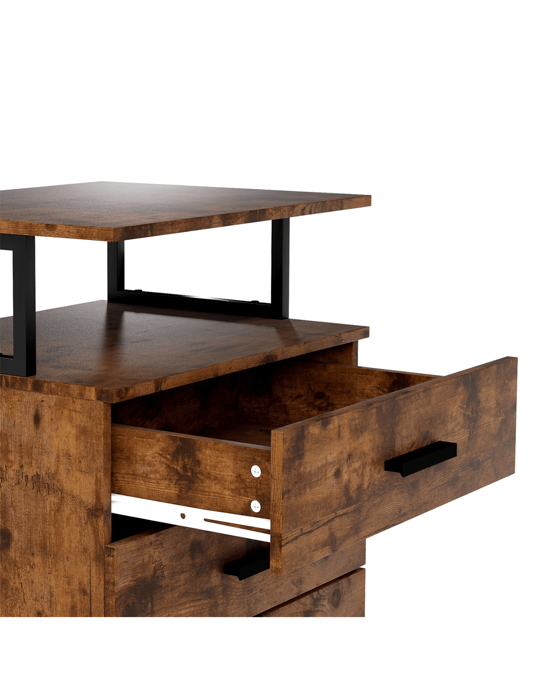 Material: E1 grade particle board ,2.5mm MDF back/ drawer bottom, matte black steel frame