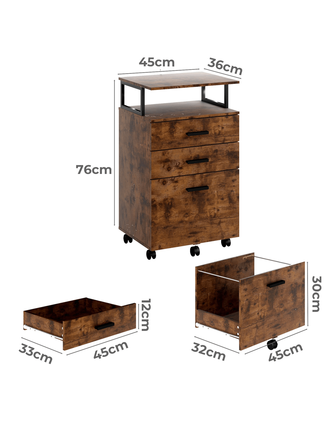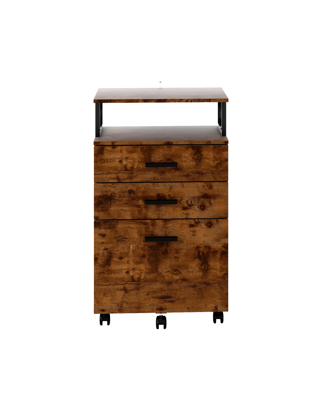 Upgrade your workspace with this stylish and practical mobile filing cabinet. Designed with a compact size, it easily fits under your desk while providing generous storage solutions. Featuring a 2 drawer filing cabinet layout plus an open shelf, it allows you to neatly organize A4 or letter-sized documents, office supplies, notebooks, and printer paper.
