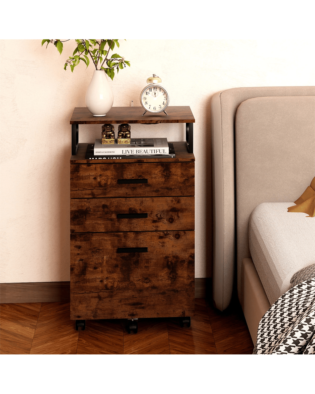 Built with a durable metal frame file cabinet structure combined with premium wooden panels, this wooden file cabinet not only looks elegant in tiger wood finish but also ensures long-lasting stability. The smooth rolling file cabinet design comes with 5 flexible casters, including 2 lockable wheels, offering effortless mobility and secure placement.