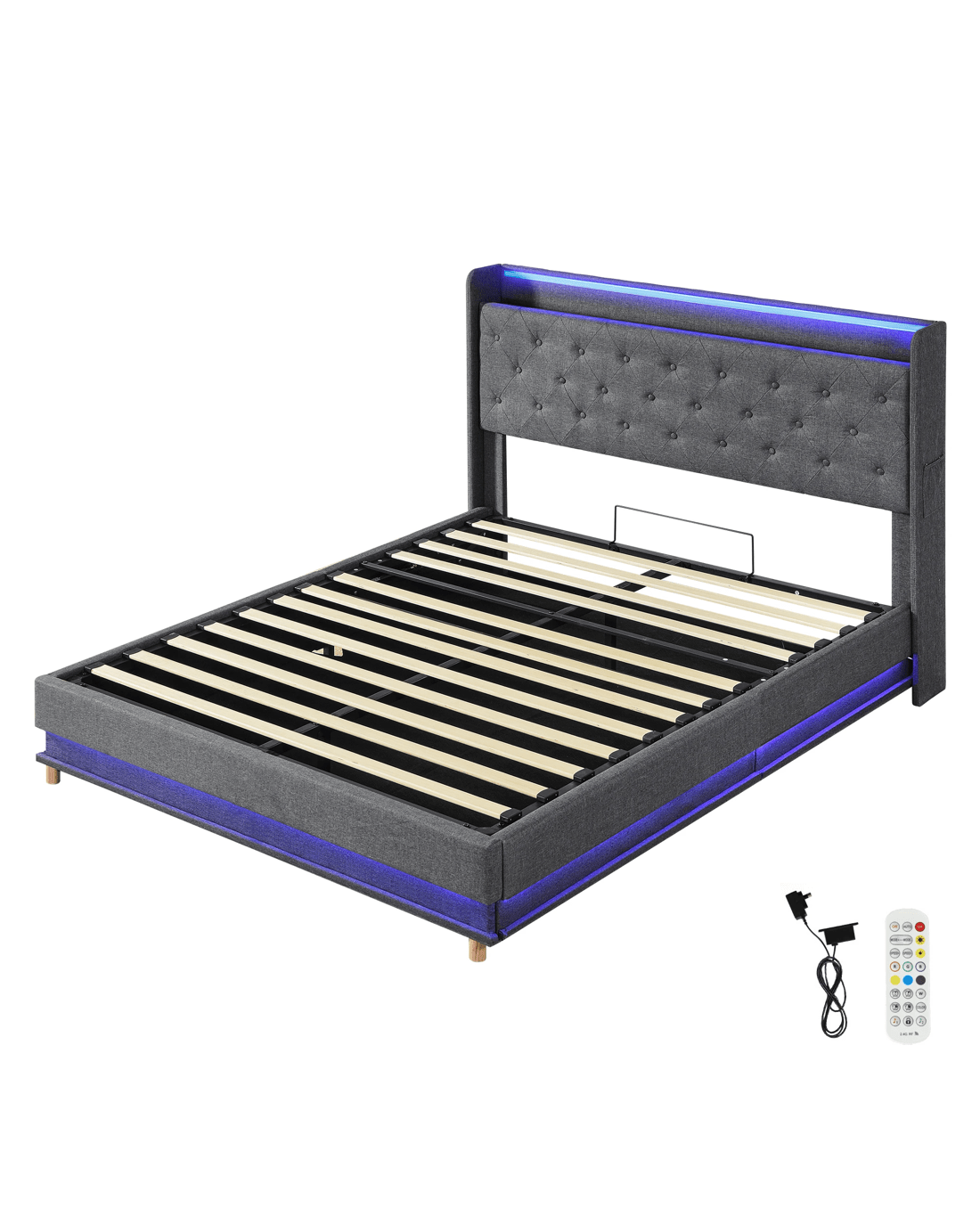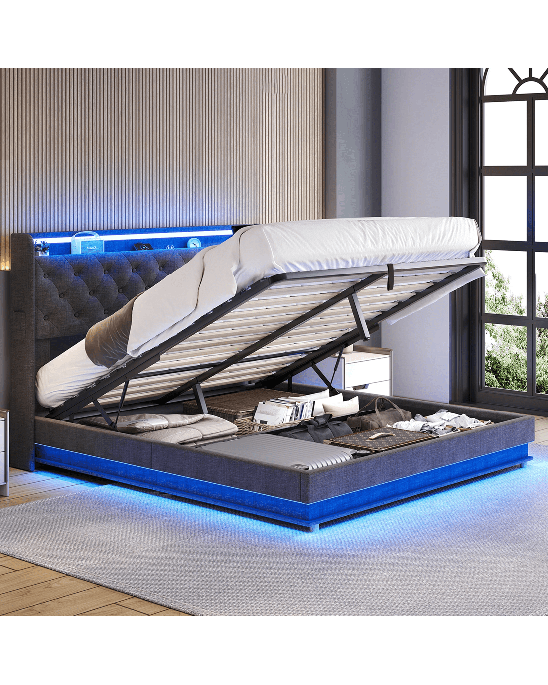 More than just a queen bed frame with storage, it features a gas lift base with a smooth hydraulic mechanism for easy hand lifting—perfect for tucking away blankets, clothes, or spare bedding. The linen-upholstered headboard includes a side pocket and built-in USB port, while RGB LED lighting adds a customisable glow. The sturdy metal structure and durable slats ensure lasting support for restful nights.