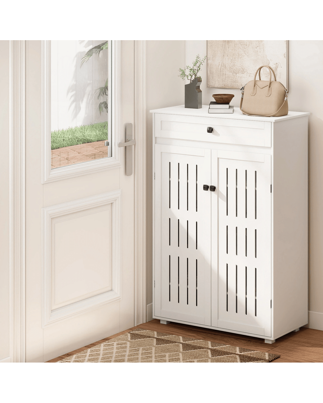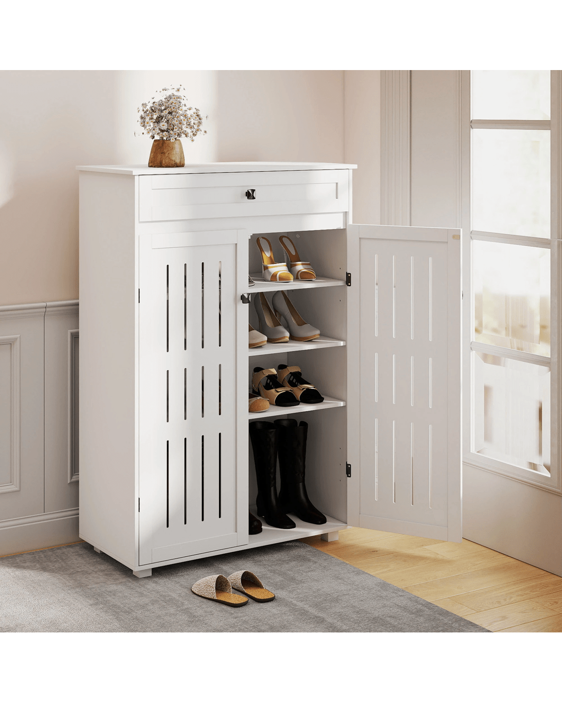 Featuring classic louvre door panels, this white shoe cabinet promotes better airflow, helping your shoes stay fresh and dry. Inside, adjustable shelves let you customise the space to fit different heights, making it an ideal shoe rack or shoe organiser for busy households. Whether used as an entryway storage solution or a hallway cabinet, the durable build ensures long-lasting stability.