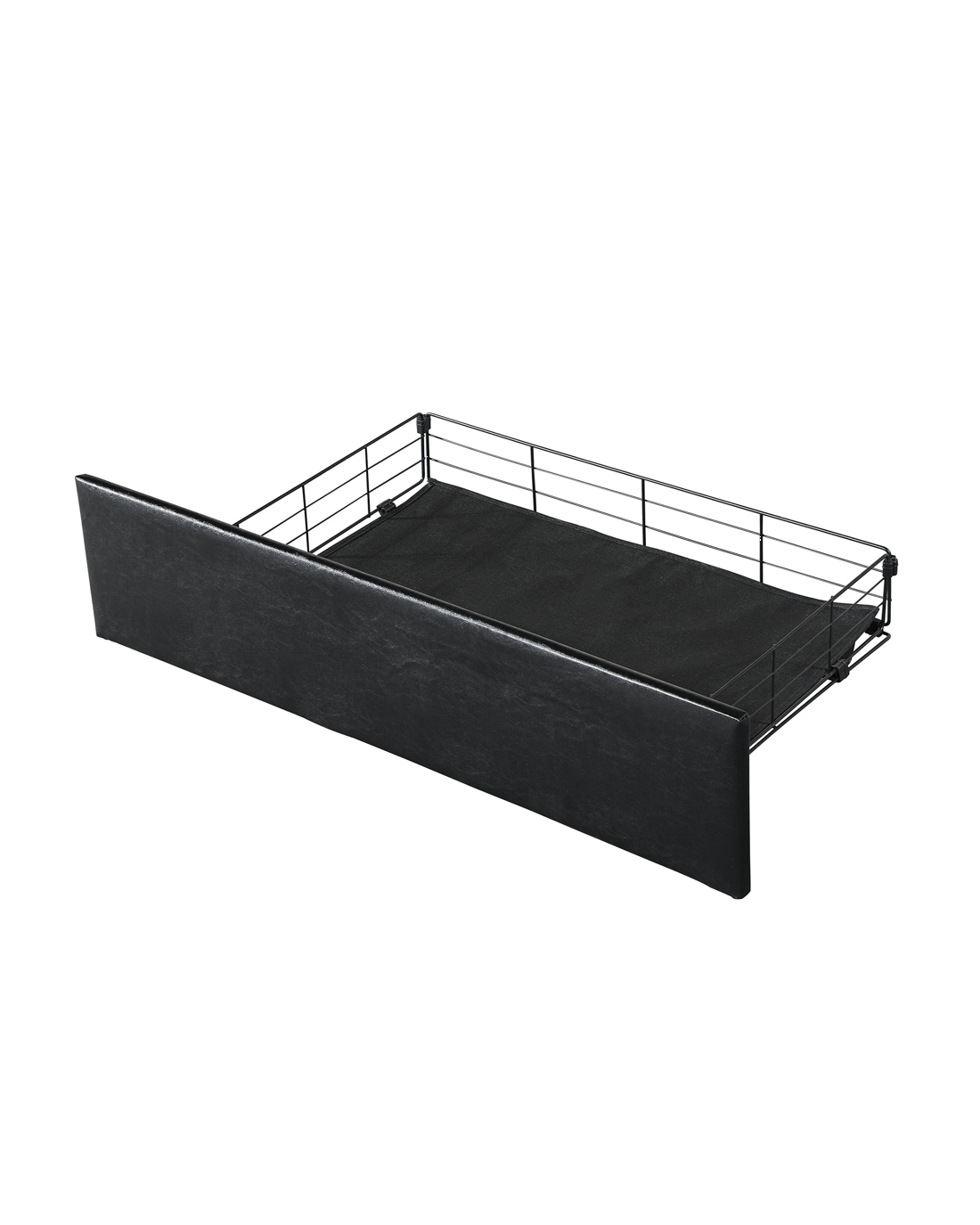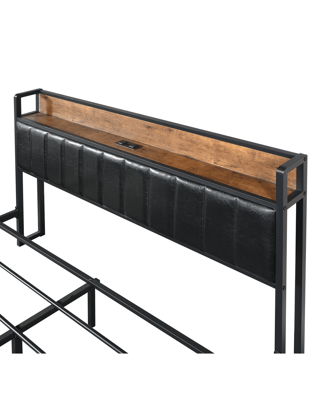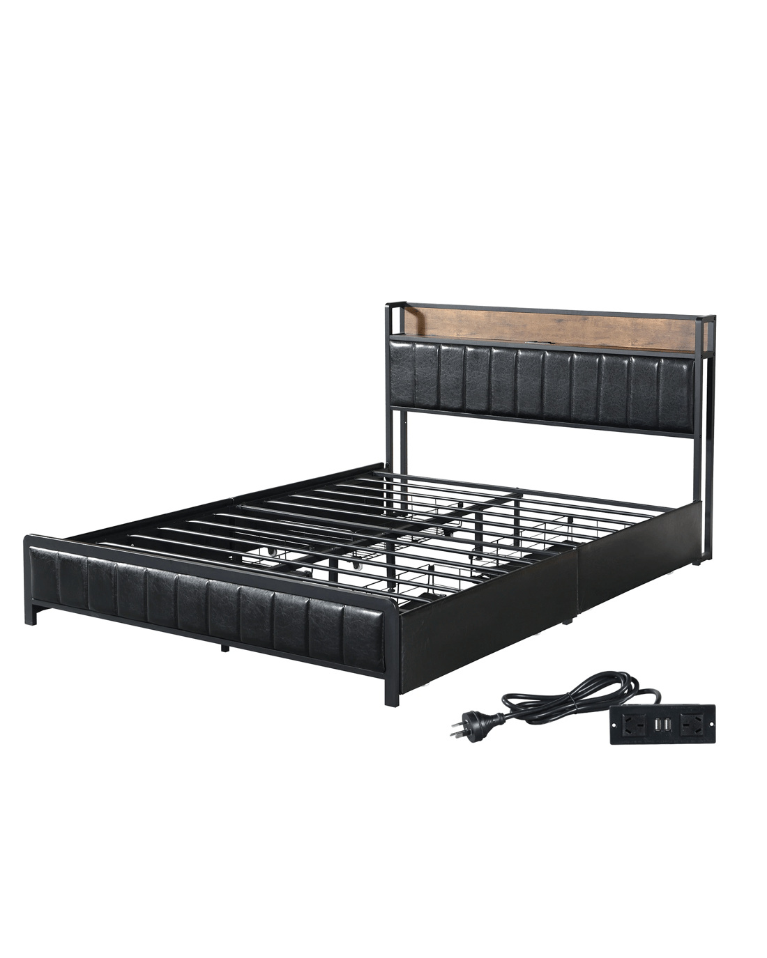 At the head of the bed, a cleverly integrated shelf features 2 AC outlets and 2 USB ports, so your devices stay powered while your space stays clutter-free. With four spacious drawers tucked beneath, this industrial storage bed frame transforms wasted floor space into a tidy storage solution—ideal for seasonal clothes, linens, or daily essentials.