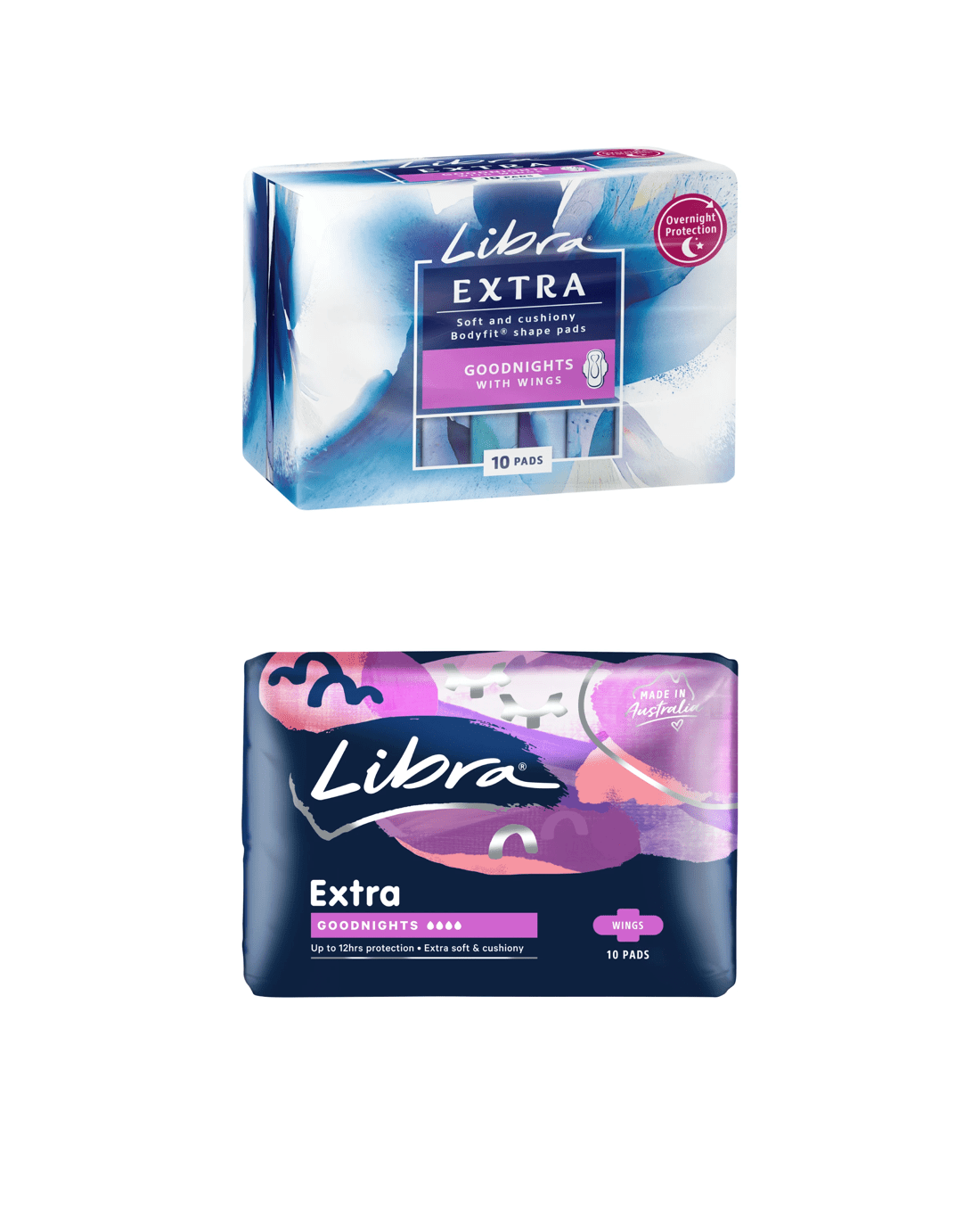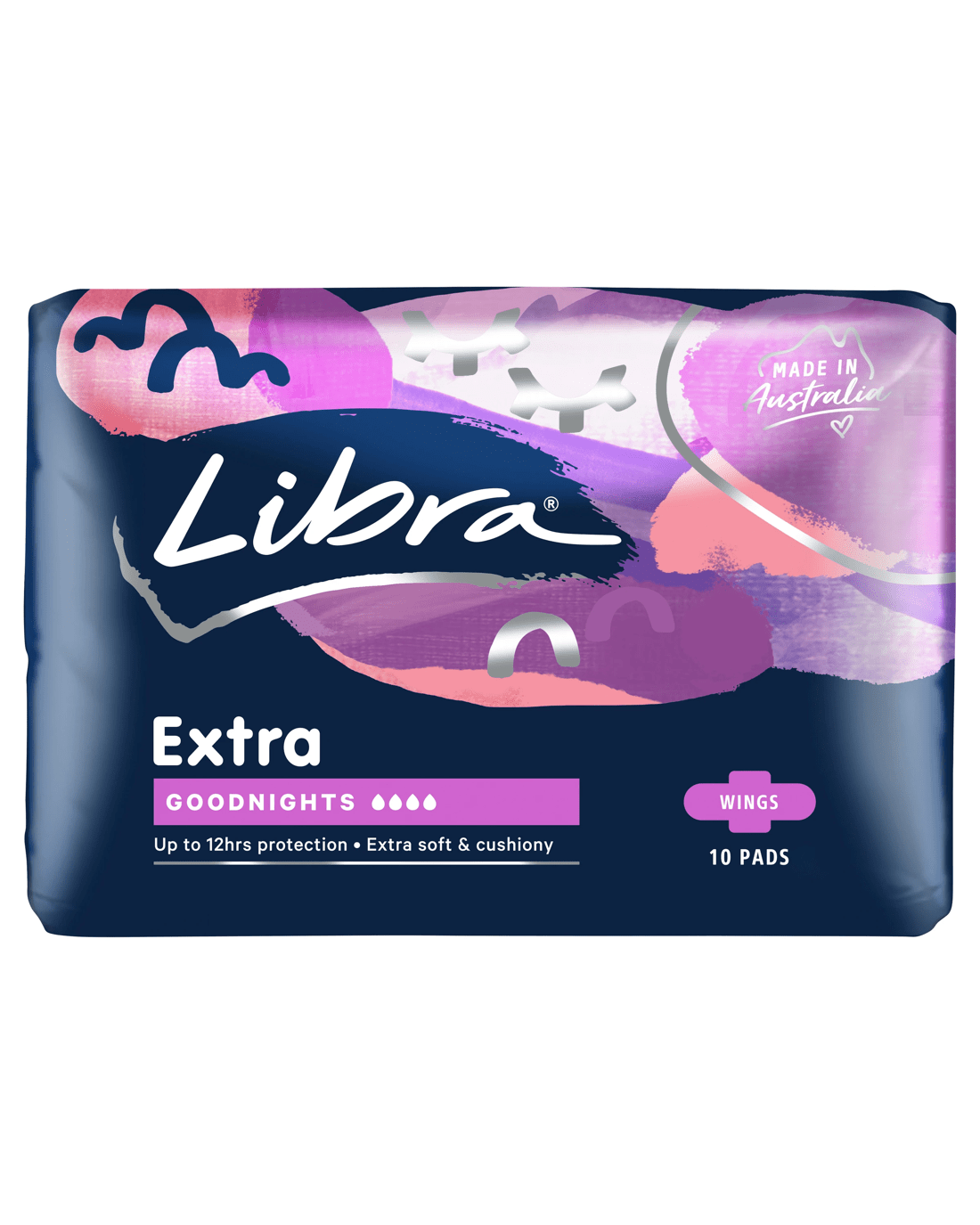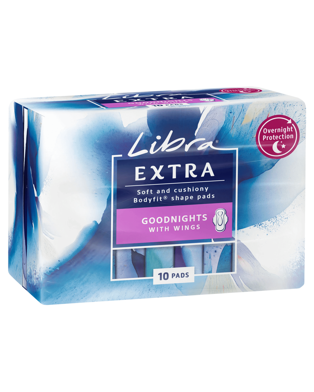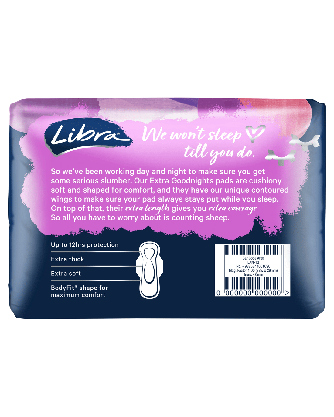 Embrace a goodnight's sleep with Libra Extra Goodnights Pads with Wings. With up to 12 hours of protection, they feature an extra thick yet soft layer, delivering both comfort and security when you need it most. Carefully designed with a unique BodyFit shape that moulds to your body for comfort like a second skin, and curved wings that keep the pad securely in place throughout the night. Our Extra's range helps you to handle the heaviest of flows with ease. The high absorbency is complemented by extra length, providing extra coverage in any sleeping position. Libra Extra Goodnights Pads are more than just a bedtime essential; they're a cushiony piece of comfort so that you can sleep well and face the day with confidence.