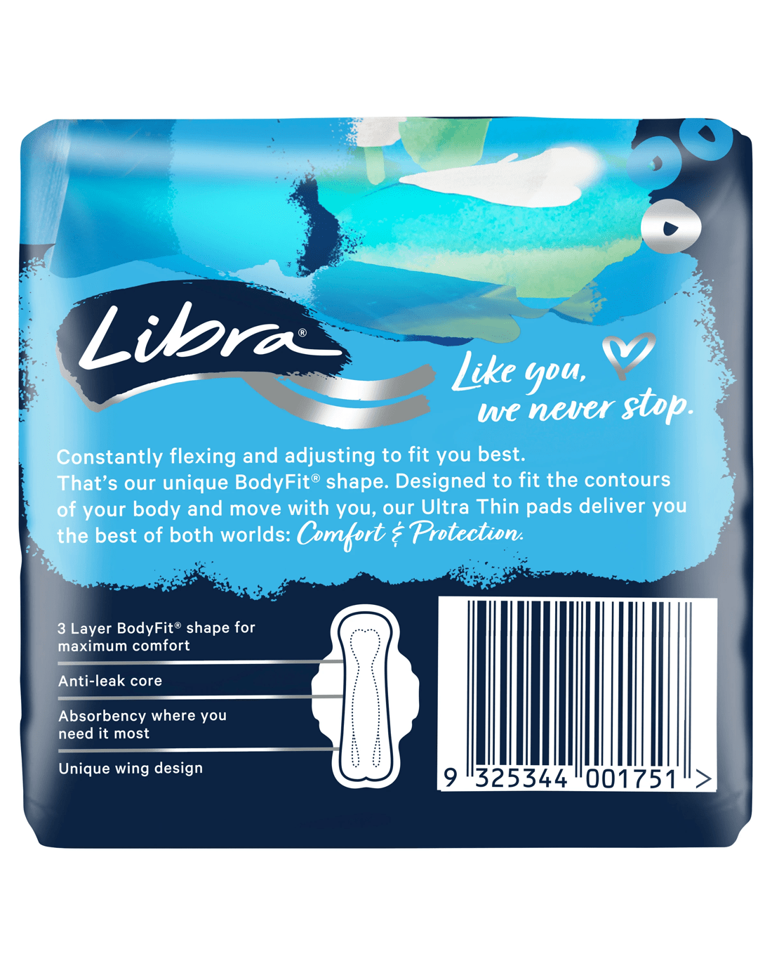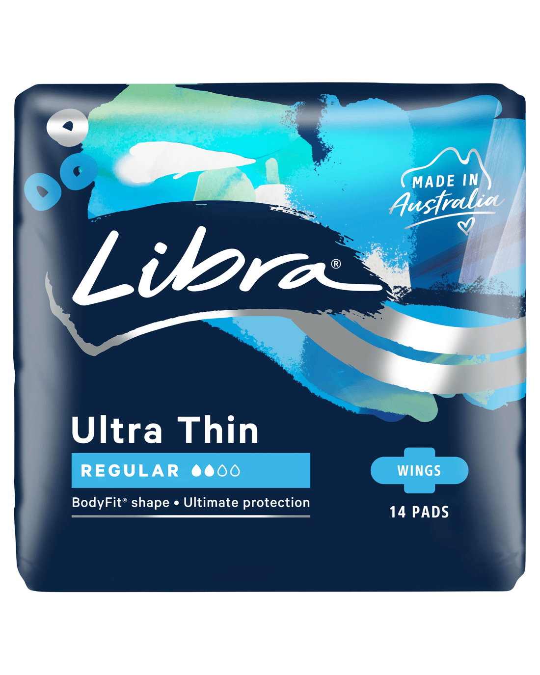 Start your day with confidence with Libra Ultra Thin Regular Pads with Wings. Each pad in has been carefully designed with a unique BodyFit shape that moulds to your body for comfort; so natural it's like a second skin. Leak-free absorbency is key; our pads are designed to absorb up to 10 times their weight, making them ideal for your regular flow. The innovative three-layer core provides targeted absorbency and leakage protection, while the curved wings keep the pad securely in place - because nothing should hold you back. These pads are light and flexible. The pads allow you to move freely, laugh out loud, and live life to the fullest. With over 40 years' experience Libra is here to support you through every moment of your cycle.