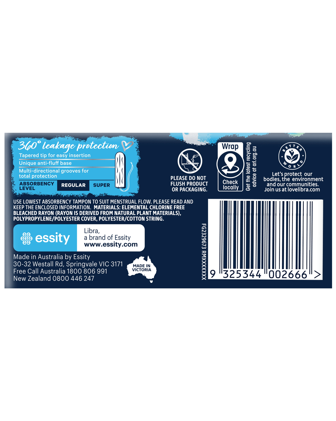 Start your day using Libra Body Fit Regular Tampons, the everyday essential for when you have your period. Designed for medium-flow days, typically around days 2-3, these tampons offer the ideal balance of comfort and protection. At the heart of our design is the tapered tip for easy and comfortable insertion. The unique anti-fluff base helps prevents fluffing when the string is released, ensuring a clean use. For total protection, these tampons are equipped with multi-directional grooves that provide 360deg. leak protection. This advanced feature adapts to your body's movements giving you peace of mind, whether you're at work, working out or simply going about your day. With over 40 years' experience Libra is here to support you through every moment of your cycle.