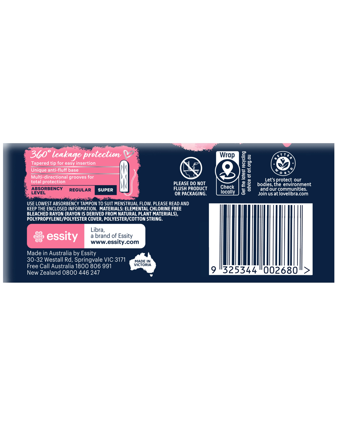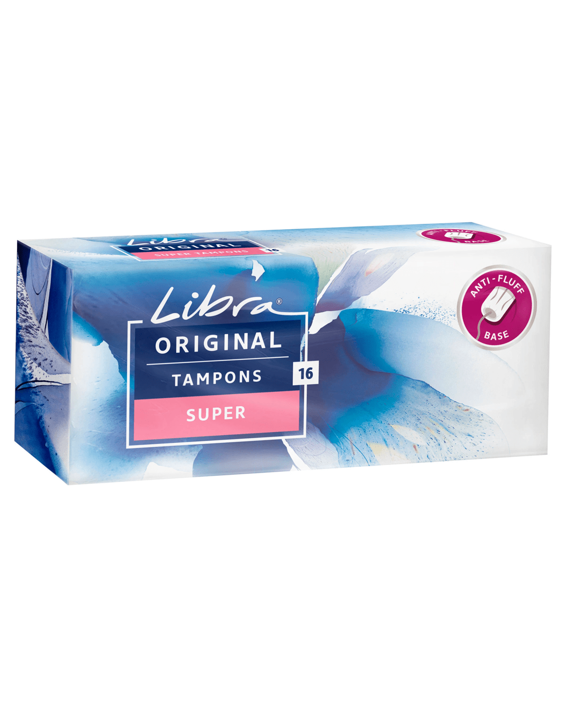 Start your day using Libra Body Fit Super Tampons, the everyday essential for when you have your period. Designed for heavy-flow days, typically around days 1-2, these tampons offer the ideal balance of comfort and protection. At the heart of our design is the tapered tip for easy and comfortable insertion. The unique anti-fluff base is a thoughtful addition that prevents fluffing when the string is released, ensuring a clean use. For total protection, these tampons are equipped with multi-directional grooves that provide 360deg. leak protection. This advanced feature adapts to your body's movements giving you peace of mind, whether you're at work, working out or simply going about your day. With over 40 years' experience Libra is here to support you through every moment of your cycle.