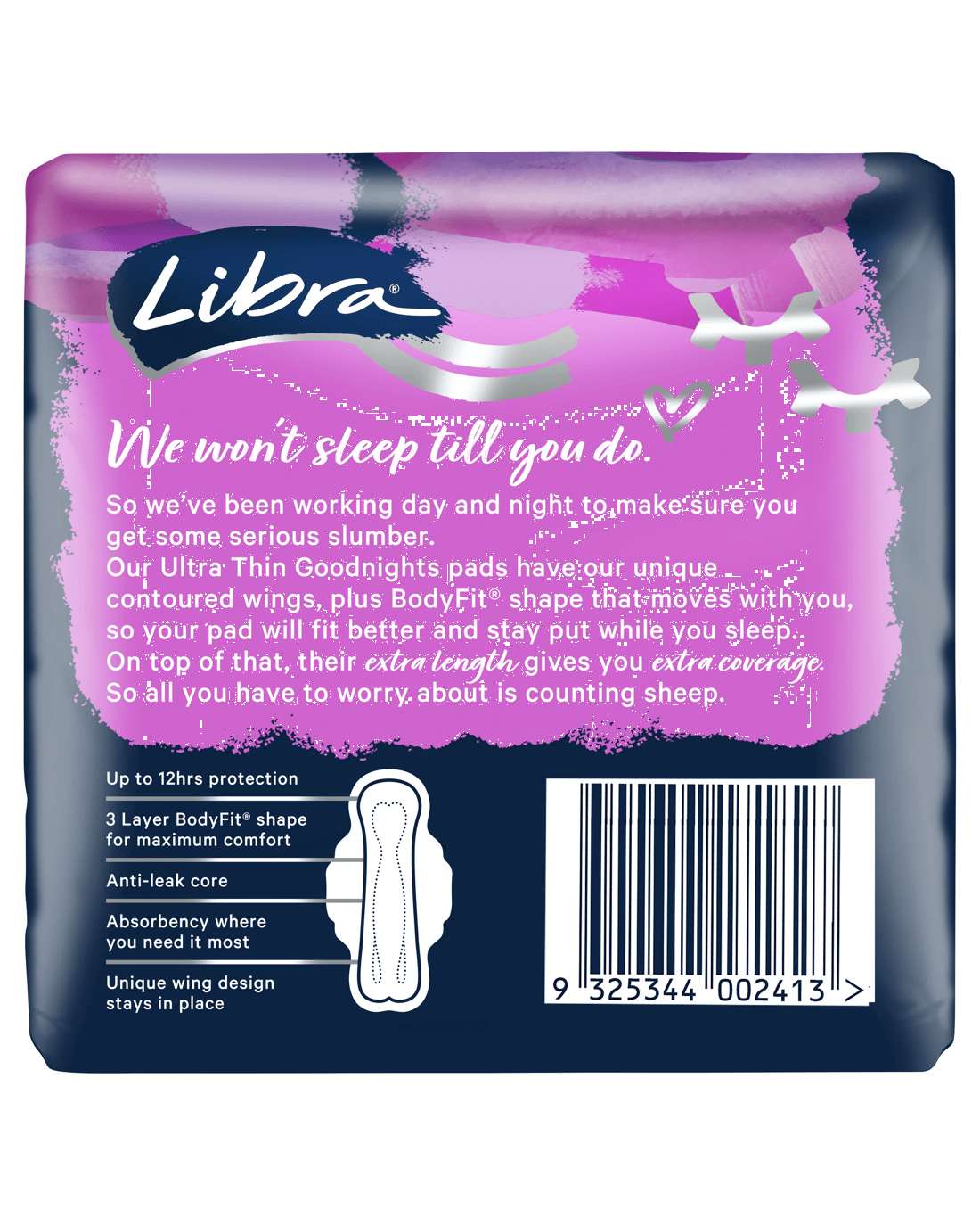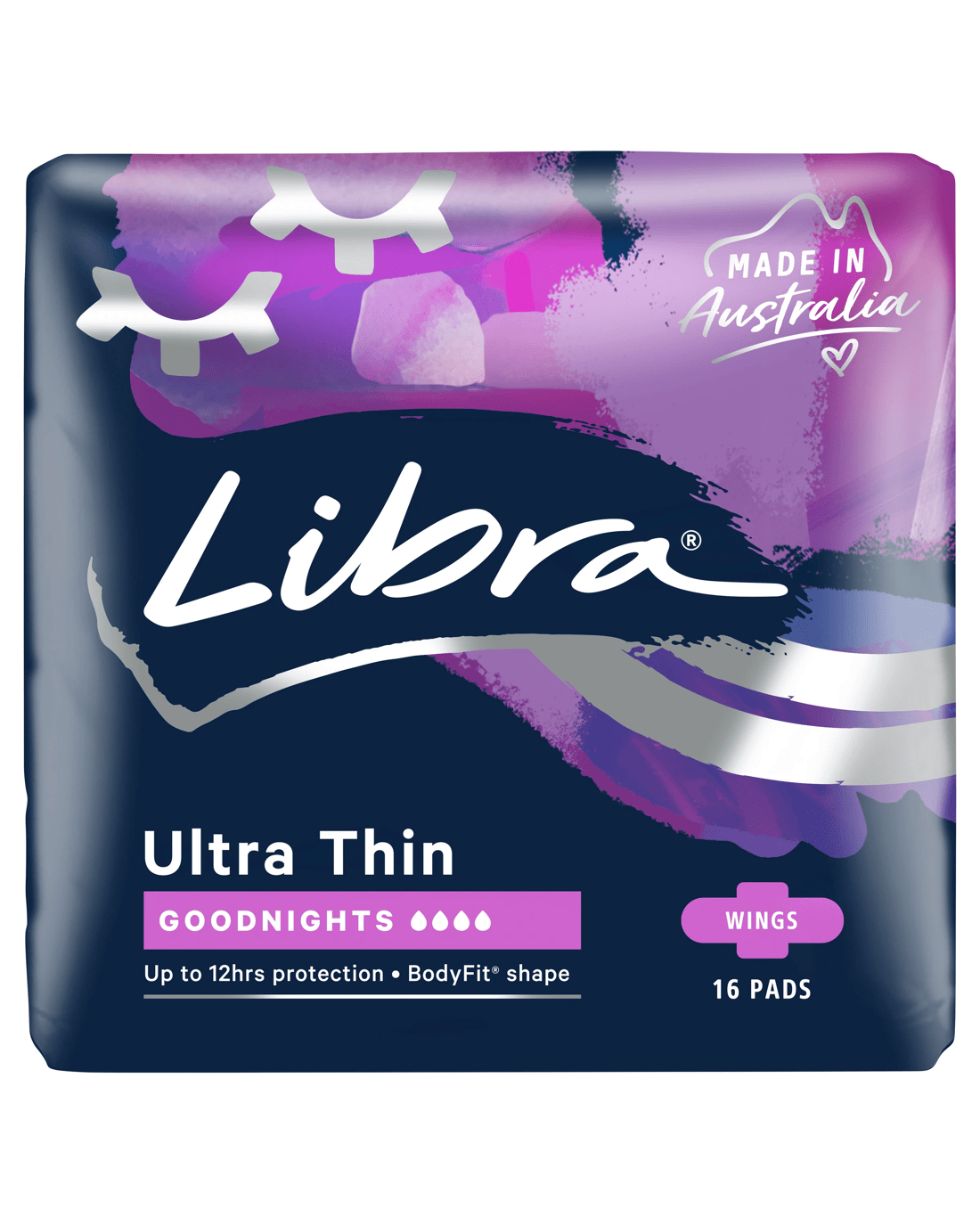 Welcome a serene night's sleep with the Libra Ultra Thin Goodnights Pads with Wings - your partner for a goodnight’s sleep. Carefully designed with our unique BodyFit shape that moulds to your body for comfort like a second skin, and curved wings that keep the pad securely in place. The pads adapt to every turn while you sleep for security and peace of mind. Rest assured with our anti-leak core, you are protected up to 12 hours. The innovative three-layer core also provides targeted absorbency and leakage protection for a worry-free night. Tailored to ensure a restful night, they offer a balanced blend of flexibility and absorbency, while their extra length offers superior coverage. Libra Ultra Thin Goodnights Pads are more than just a nighttime necessity; they are there to help alleviate your worries so you can enjoy undisturbed sleep and wake up feeling refreshed and ready to take on the day.