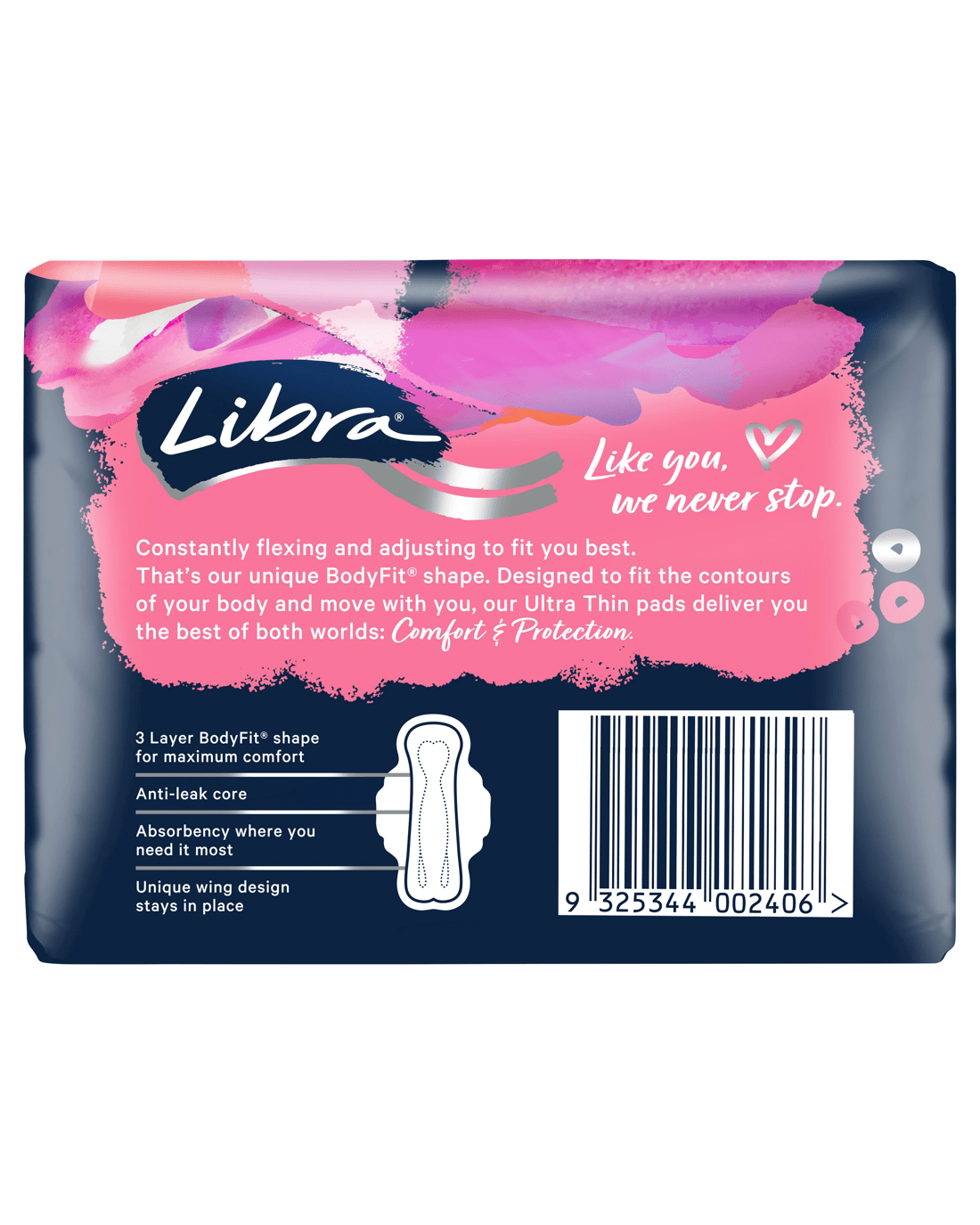 Start your day confidently with Libra Ultra Thin Super Pads with Wings. Each pad in this 18-pack has been carefully designed with a unique BodyFit shape that moulds to your body for comfort; so natural it's like a second skin. Leak-free absorbency is key; our pads are designed to absorb up to 10 times their weight, making them ideal for your heavy flow days. The innovative three-layer core provides targeted absorbency and leakage protection, while the curved wings keep the pad securely in place - because nothing should hold you back. The pads are light and flexible. They allow you to move freely, laugh out loud, and live life to the fullest. With over 40 years' experience Libra is here to support you through every moment of your cycle.