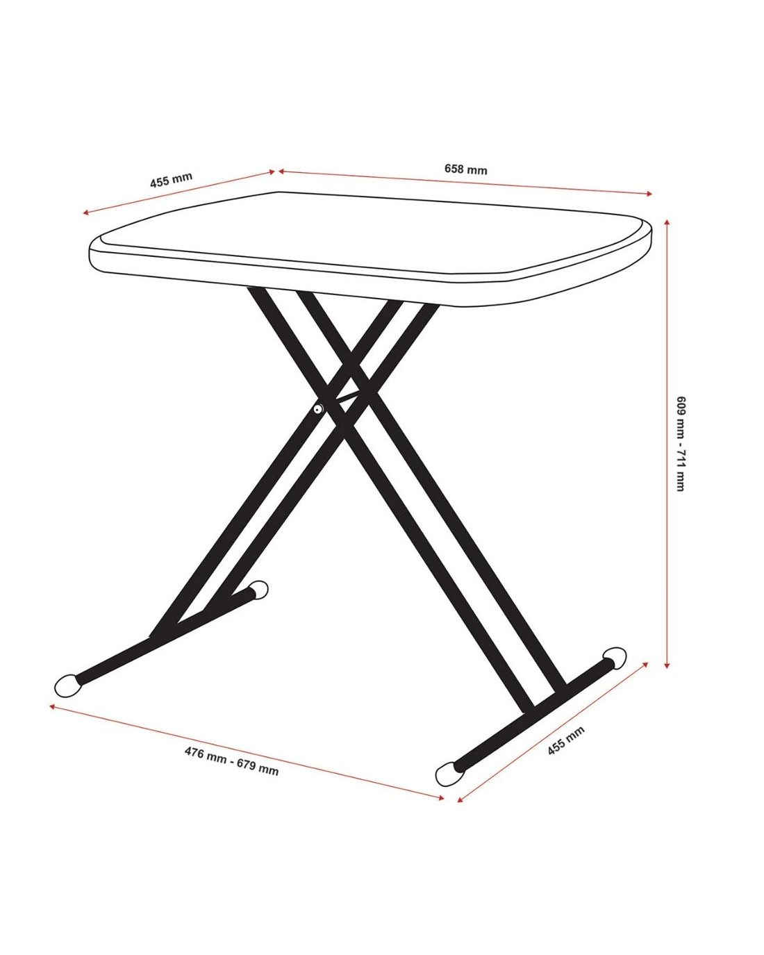 - Once assembled, the table measures 659 W x 456 D x 609/660/711 H mm.