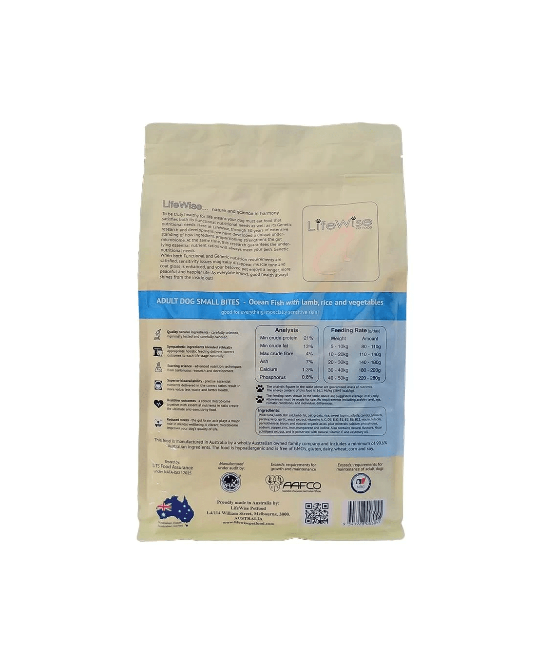 Feed your small dog Lifewise Ocean Fish Lamb & Vegetable Small Bites Dog Food is a firm favourite food for small breed adult dogs. This scientifically balanced dog food is made with delicious wild ocean fish, Australian lamb, rice, oast and a variety of vegetables as well as added vitamins, minerals and essential oils to provide your dog with a holistic and balanced diet. Lifewise Ocean Fish Lamb & Vegetable Small Bites Dog Food is gluten free and dairy free, making it especially suitable for dogs with sensitivities and skin disorders. The addition of herbs and yeast extracts make this dog food excellent for intestinal health. Coming in a resealable bag to maintain freshness, Lifewise Ocean Fish Lamb & Vegetable Small Bites Dog Food is available in a 2.5kg and 9kg bag.