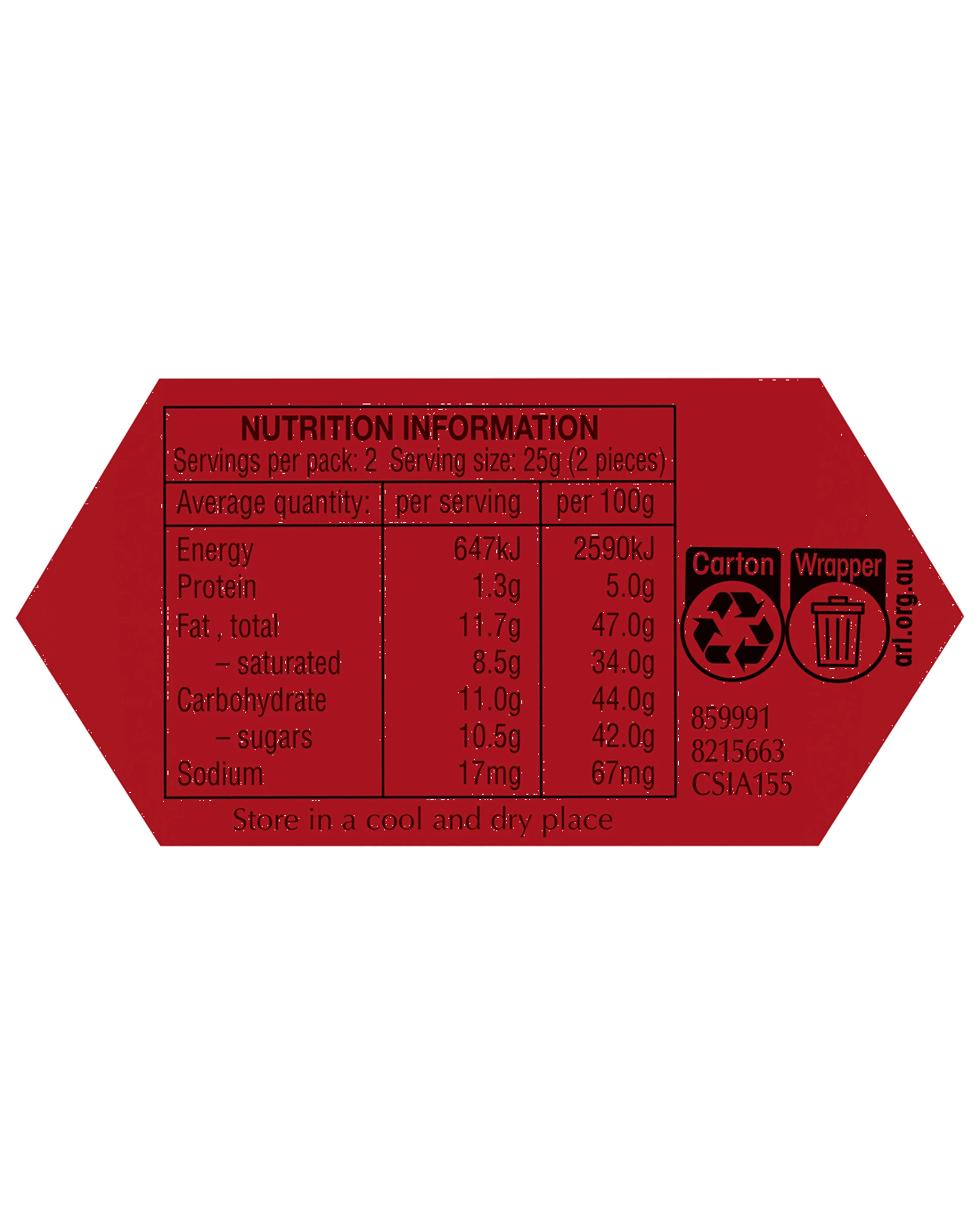 - Ingredients: Sugar, Vegetable Fats, Cocoa Butter, Cocoa Mass, Whole Milk Powder, Skim Milk Powder, Lactose, Milk Fat, Emulsifier (Soy Lecithin), Barley Malt Extract, Flavourings