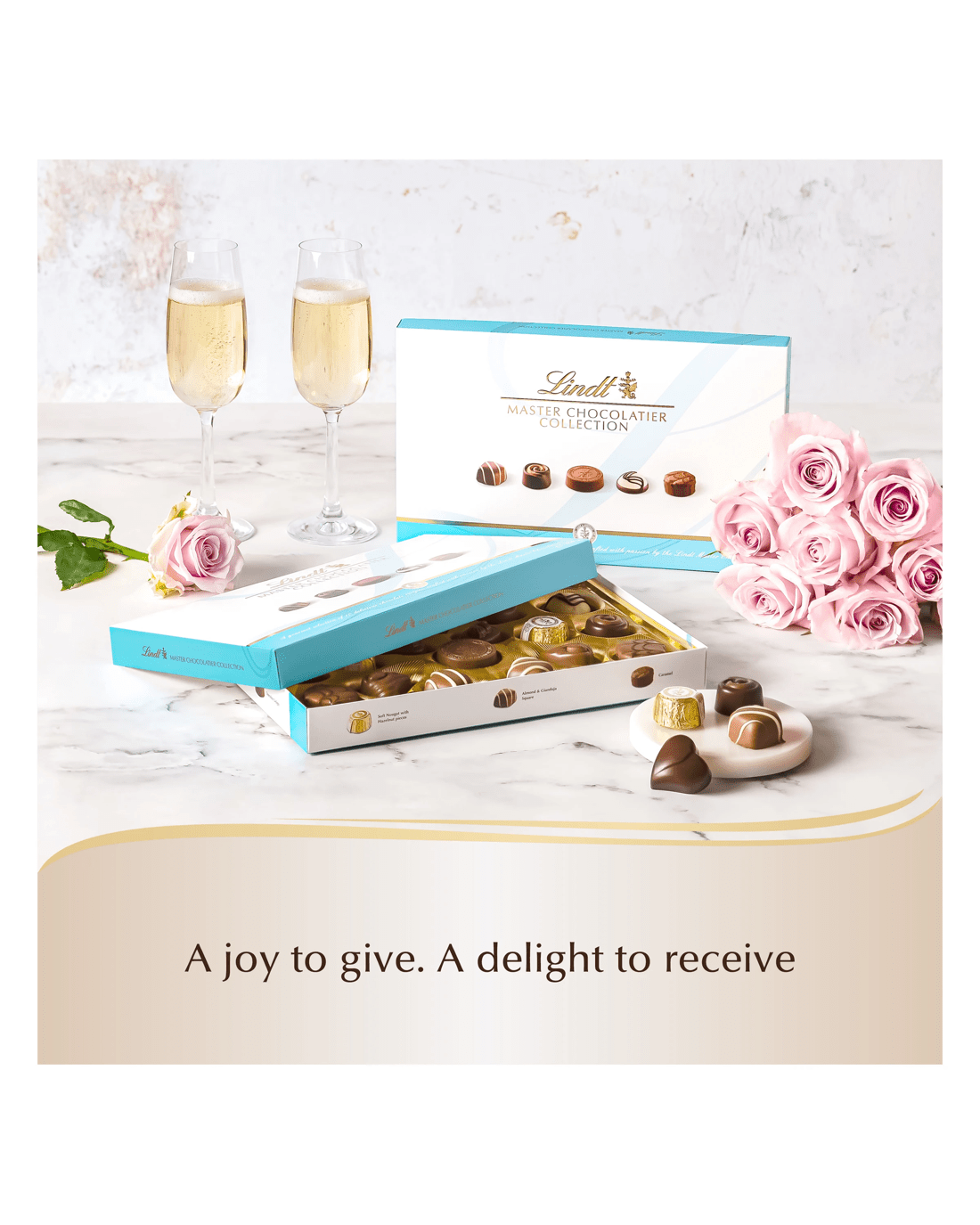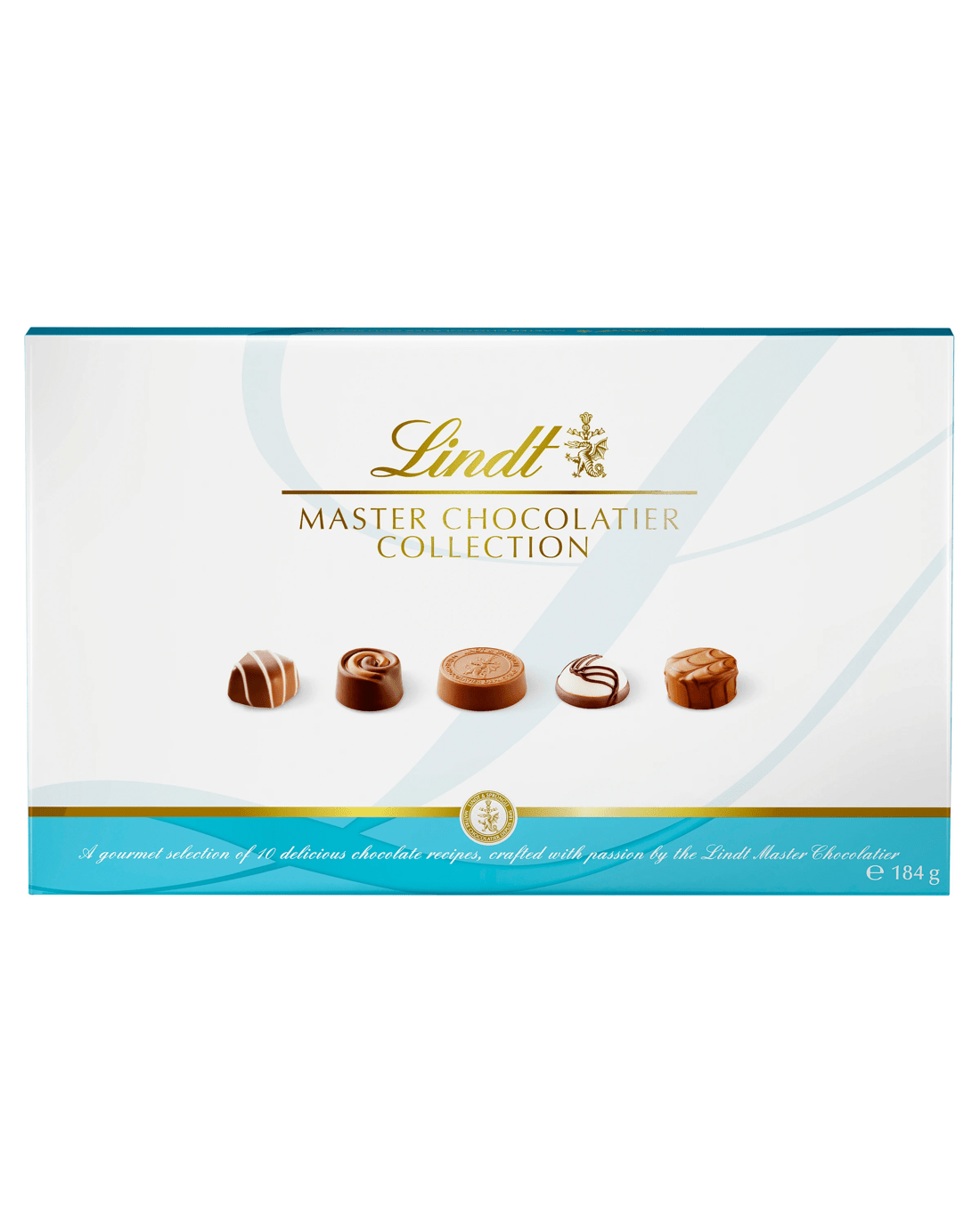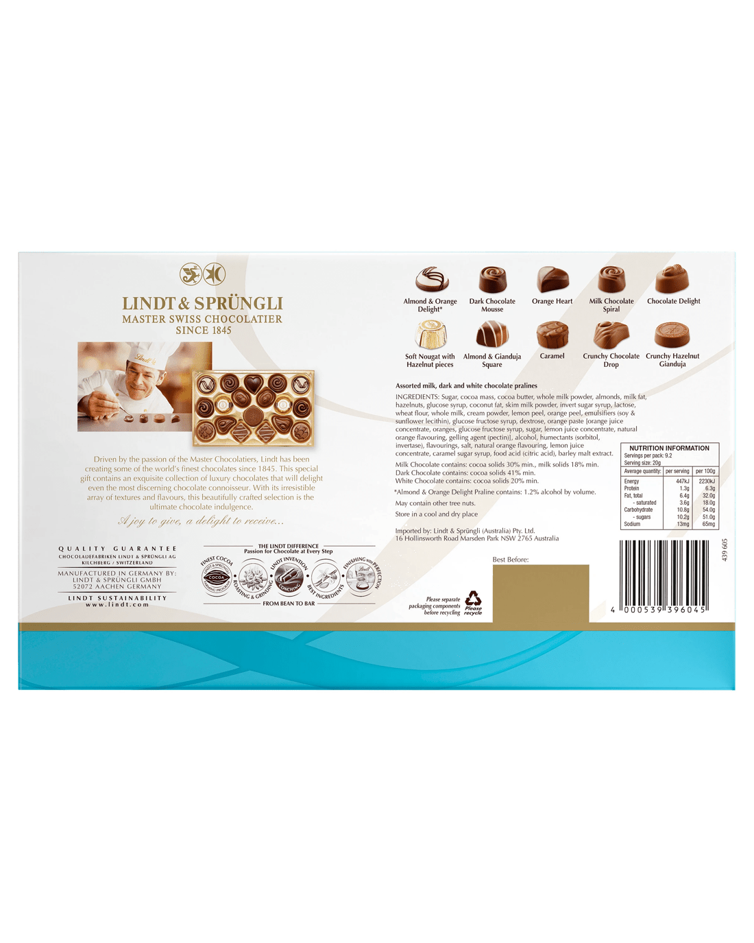 The Master chocolatier collection chocolate gift box has been created by Lindt's master chocolatier. A collection of delicious pralines with varying recipes and shapes to appeal to all chocolate lovers. Offering 18 pralines with a taste variation of 10 pralines in the finest milk, dark and white chocolate containing marzipan, roasted nuts in nougat filling, refreshing orange and smooth caramel.