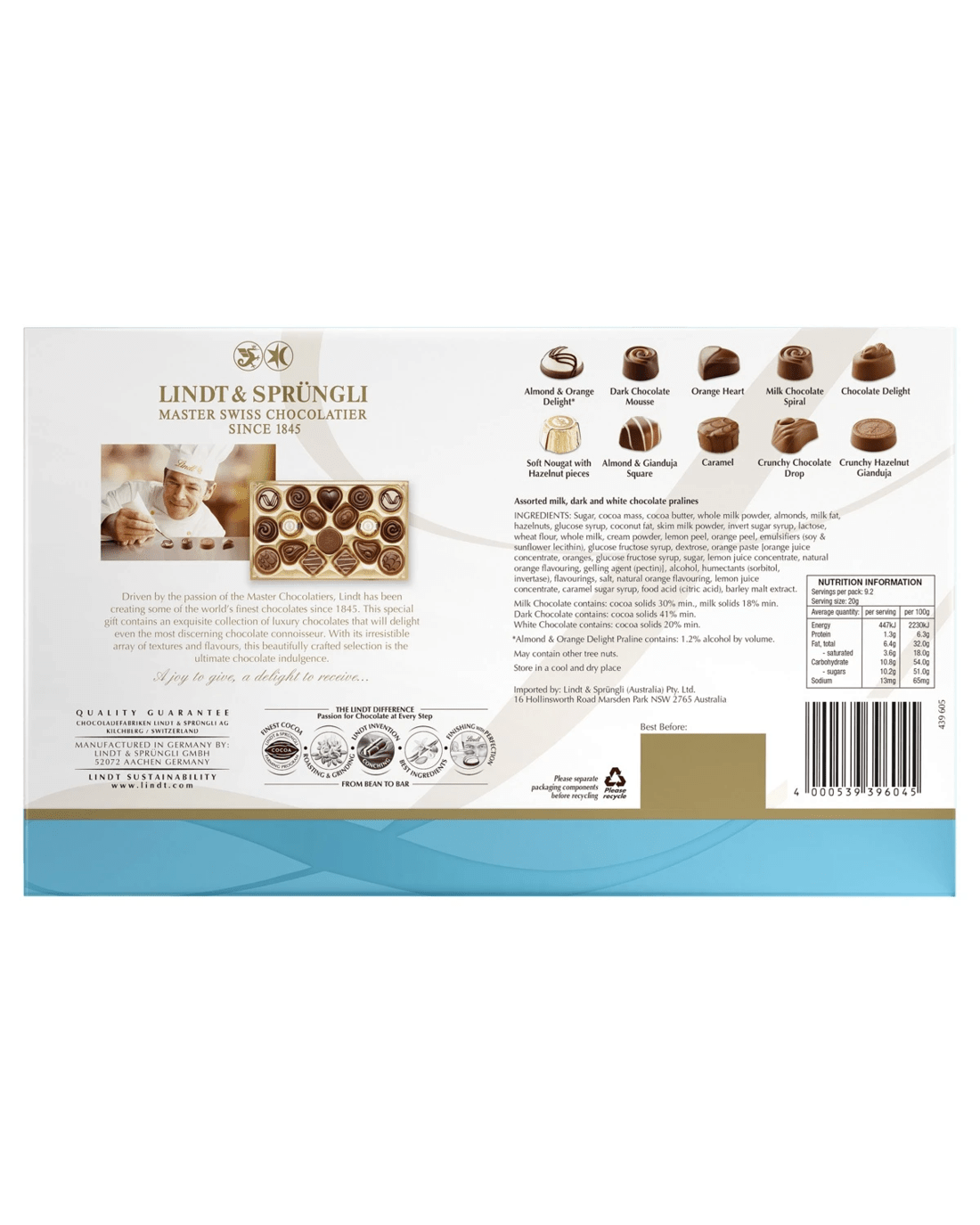 - Ingredients: Sugar, Cocoa Mass, Cocoa Butter, Whole Milk Powder, Almonds, Milk Fat, Hazelnuts, Glucose Syrup, Coconut Fat, Skim Milk Powder, Invert Sugar Syrup, Lactose, Wheat Flour, Whole Milk, Cream Powder, Lemon Peel, Orange Peel, Emulsifiers (Soy & Sunflower Lecithin), Glucose Fructose Syrup, Dextrose, Orange Paste [orange Juice Concentrate, Oranges, Glucose Fructose Syrup, Sugar, Lemon Juice Concentrate, Natural Orange Flavouring, Gelling Agent (Pectin)], Alcohol, Humectants (Sorbitol, Invertase), Flavourings, Salt, Natural Orange Flavouring, Lemon Juice Concentrate, Caramel Sugar Syrup, Food Acid (Citric Acid), Barley Malt Extract. Almond and Orange Delight Praline contains: 1.2% alcohol by volume